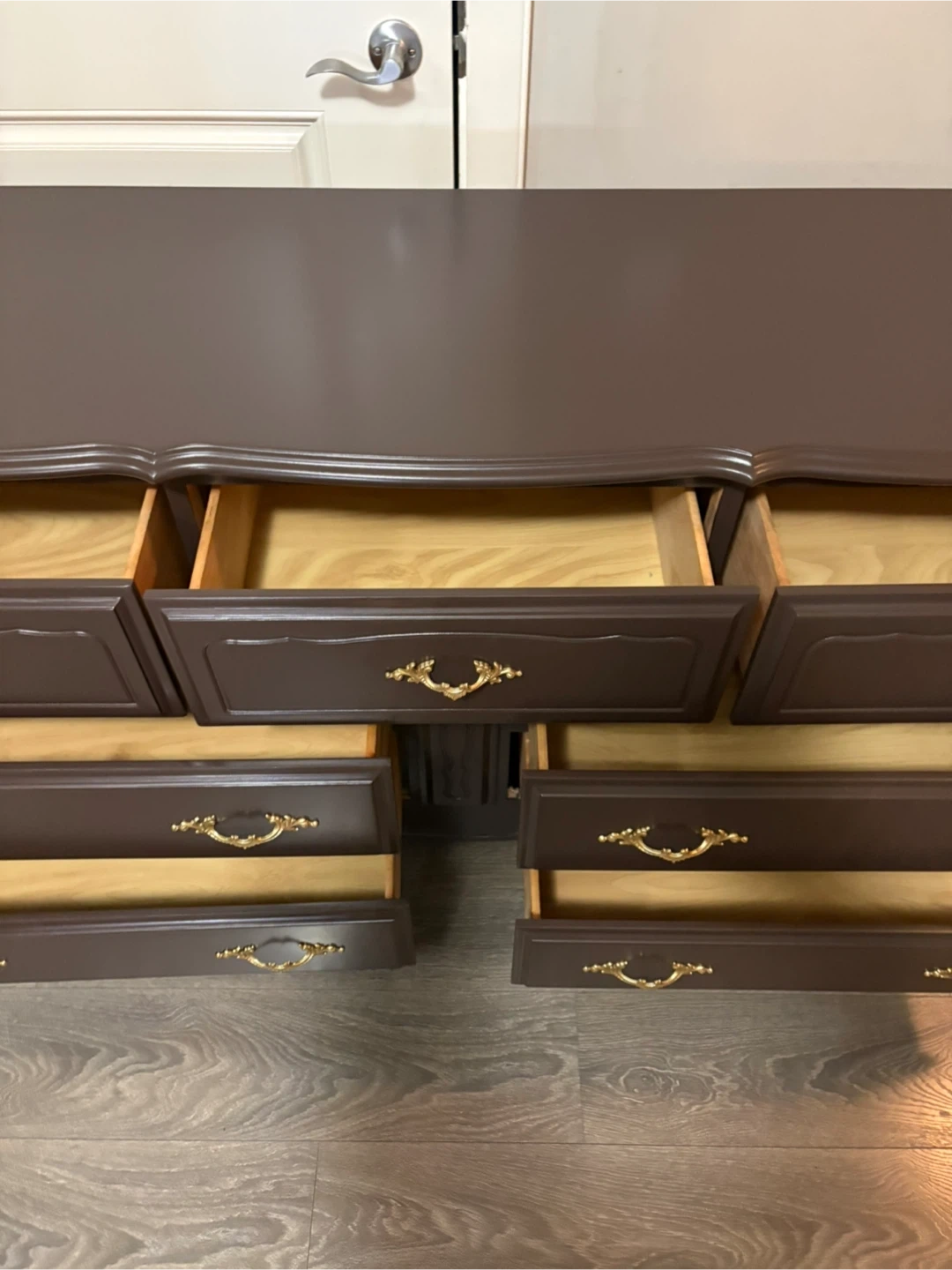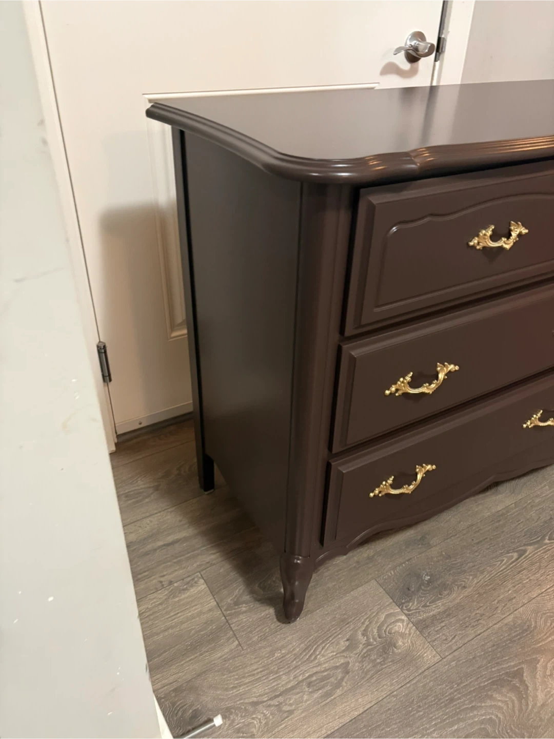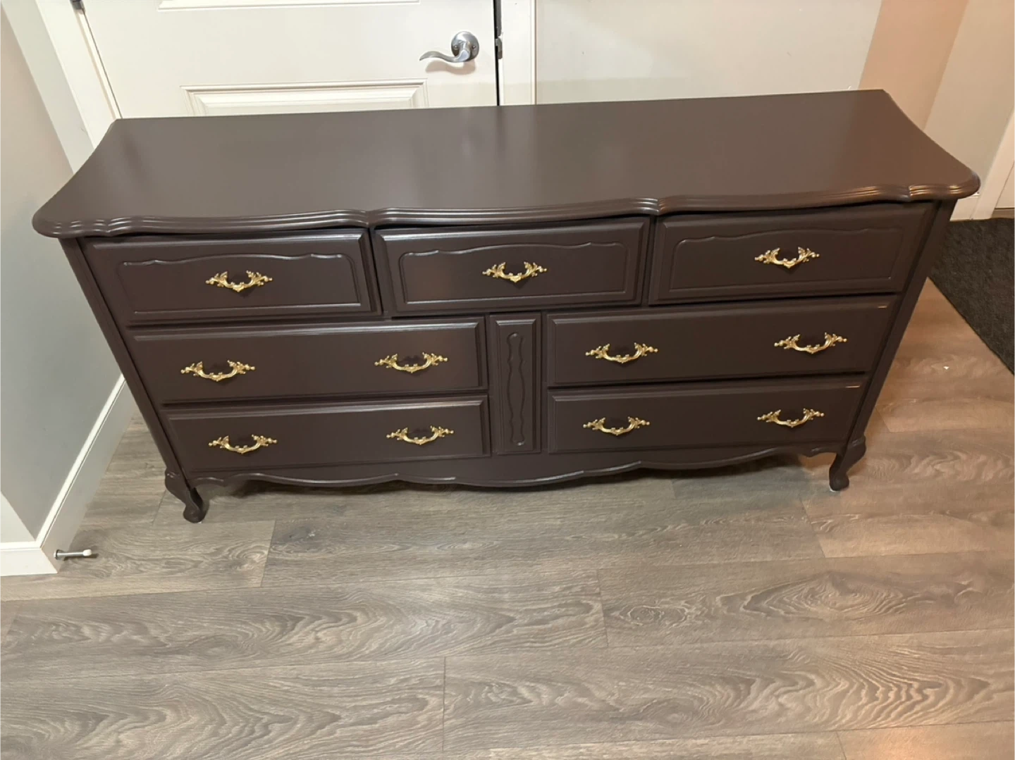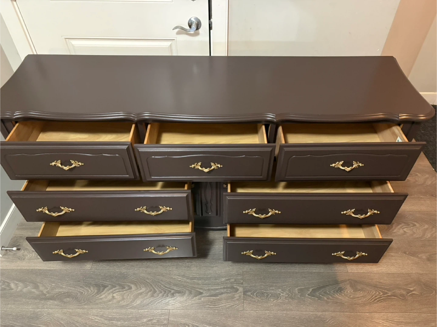 This refinised dresser in rich brown colour featuring seven drawers, with gold hardware, offering ample storage and a touch of elegance to any bedroom. The drawers are very clean and slide well. Overall in excellent condition with a vintage look.