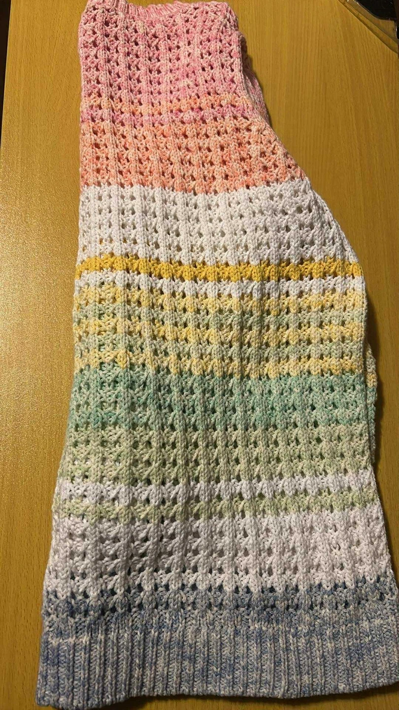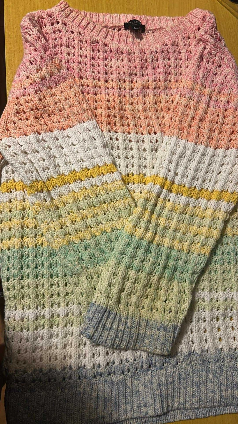 This Talbots Petite knit sweater features a colourful pastel crochet pattern. It's a size LP and made in Jordan. Its open knit design makes it a great layering piece for spring!
