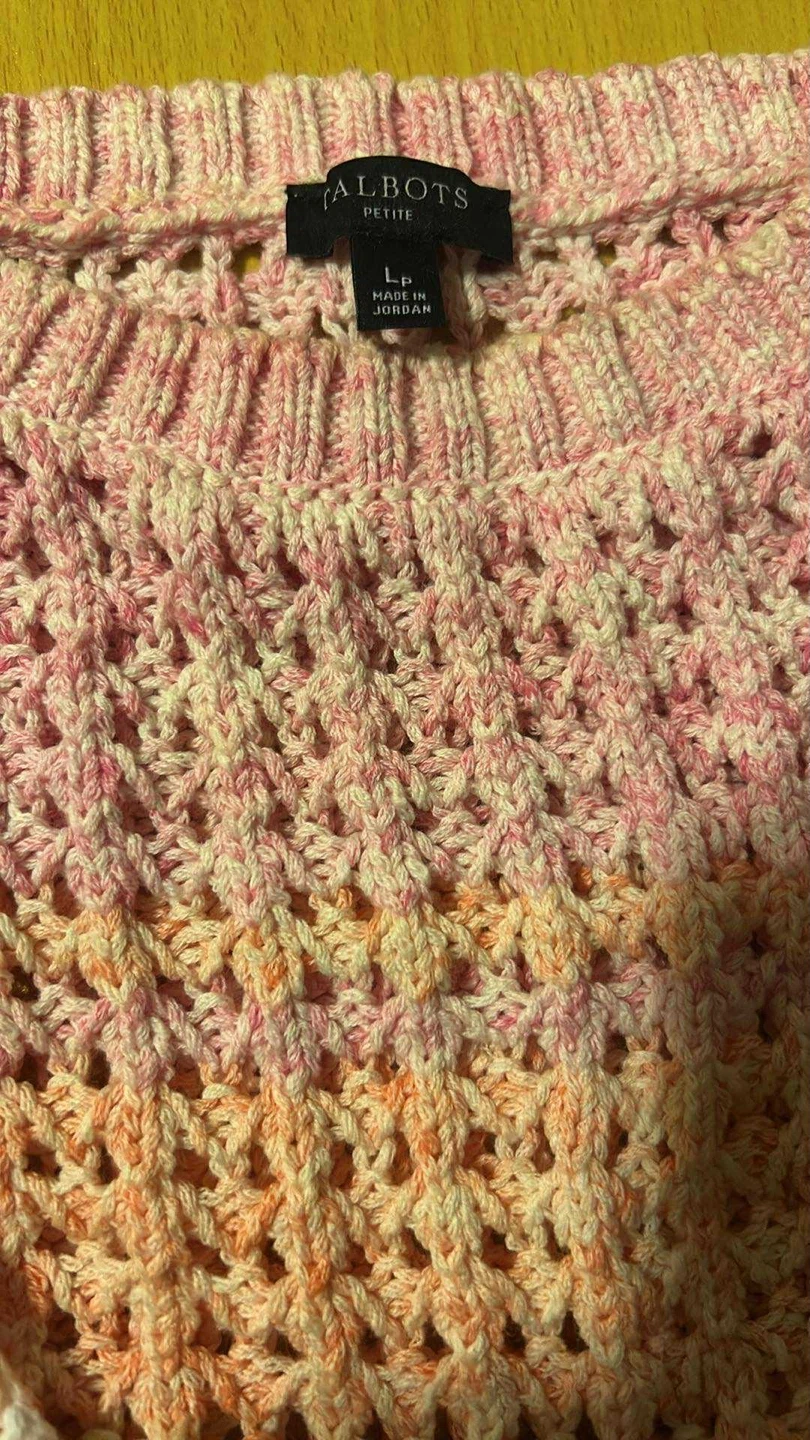 This Talbots Petite knit sweater features a colourful pastel crochet pattern. It's a size LP and made in Jordan. Its open knit design makes it a great layering piece for spring!
