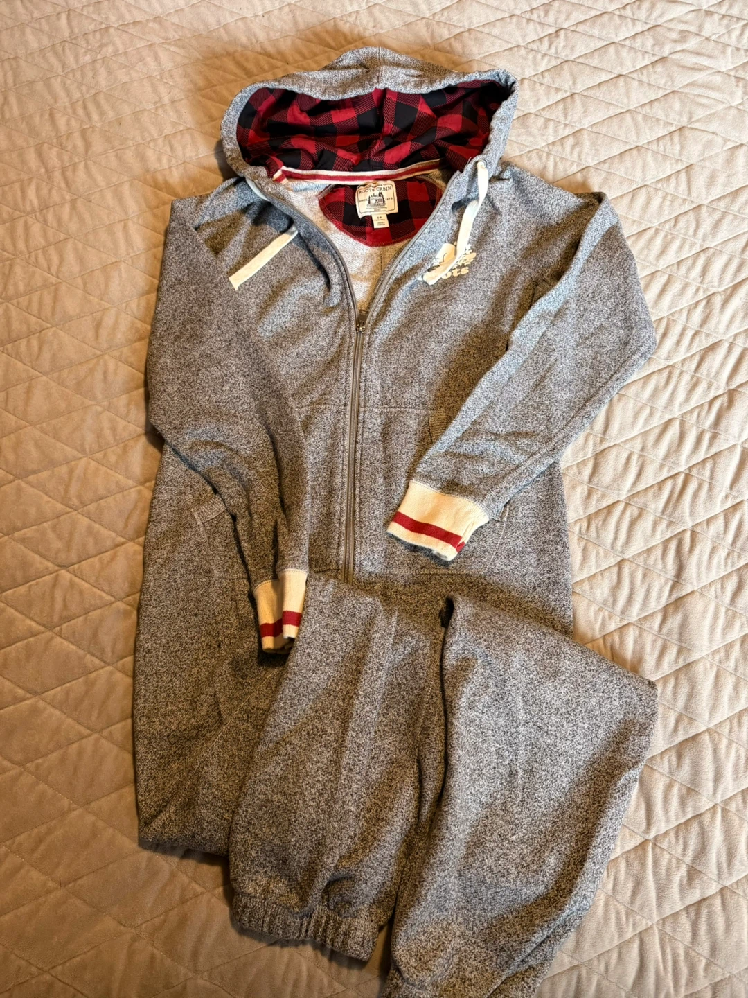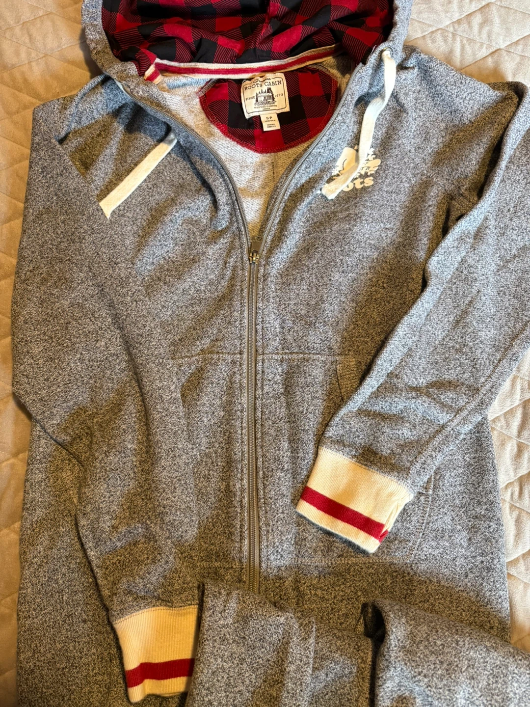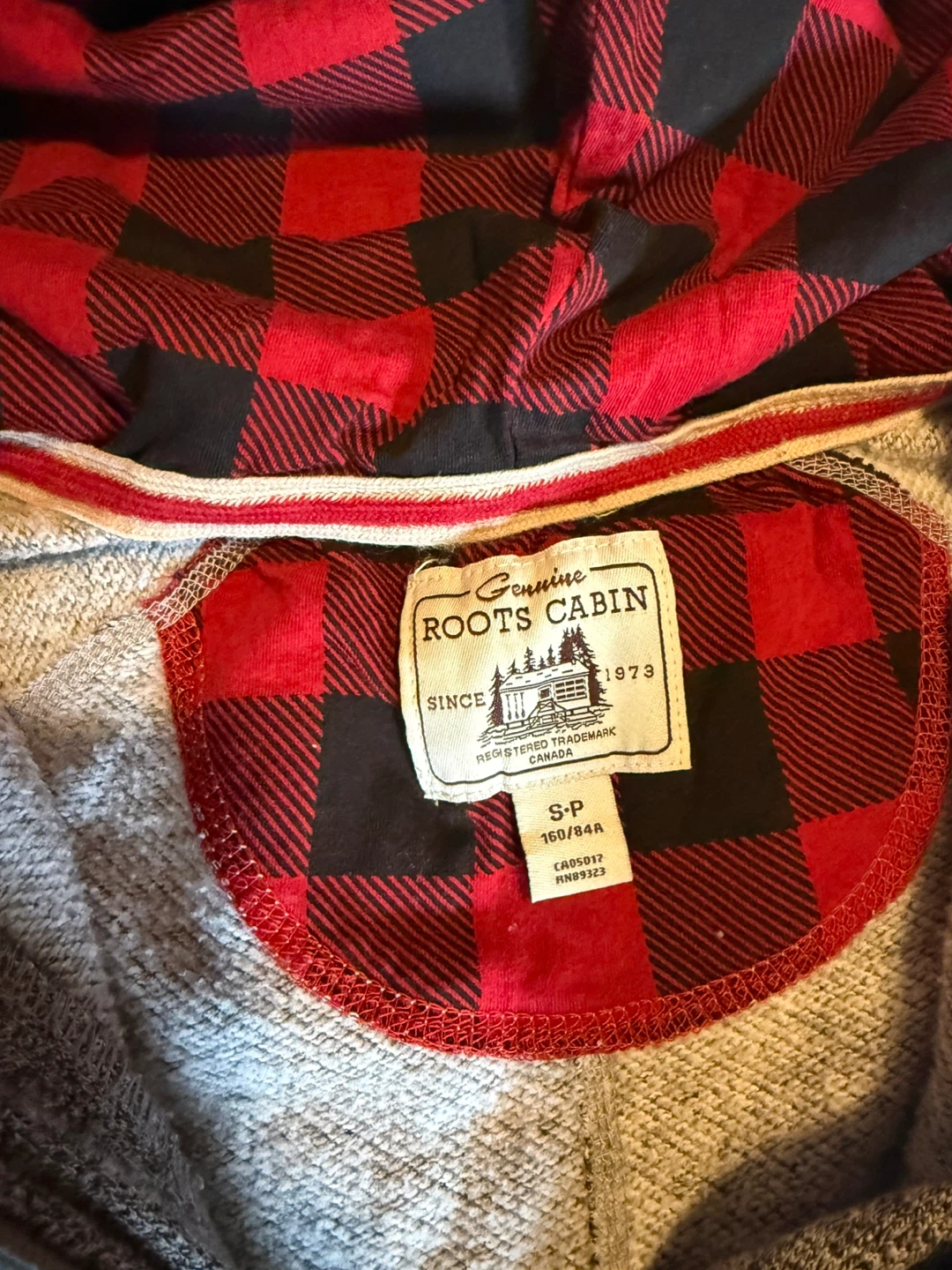 This Roots Cabin onesie features a grey heathered exterior with a red and black buffalo plaid lining. It's a size S with a zippered front and cuffed sleeves and legs. It's perfect for cozying up on a cool evening!