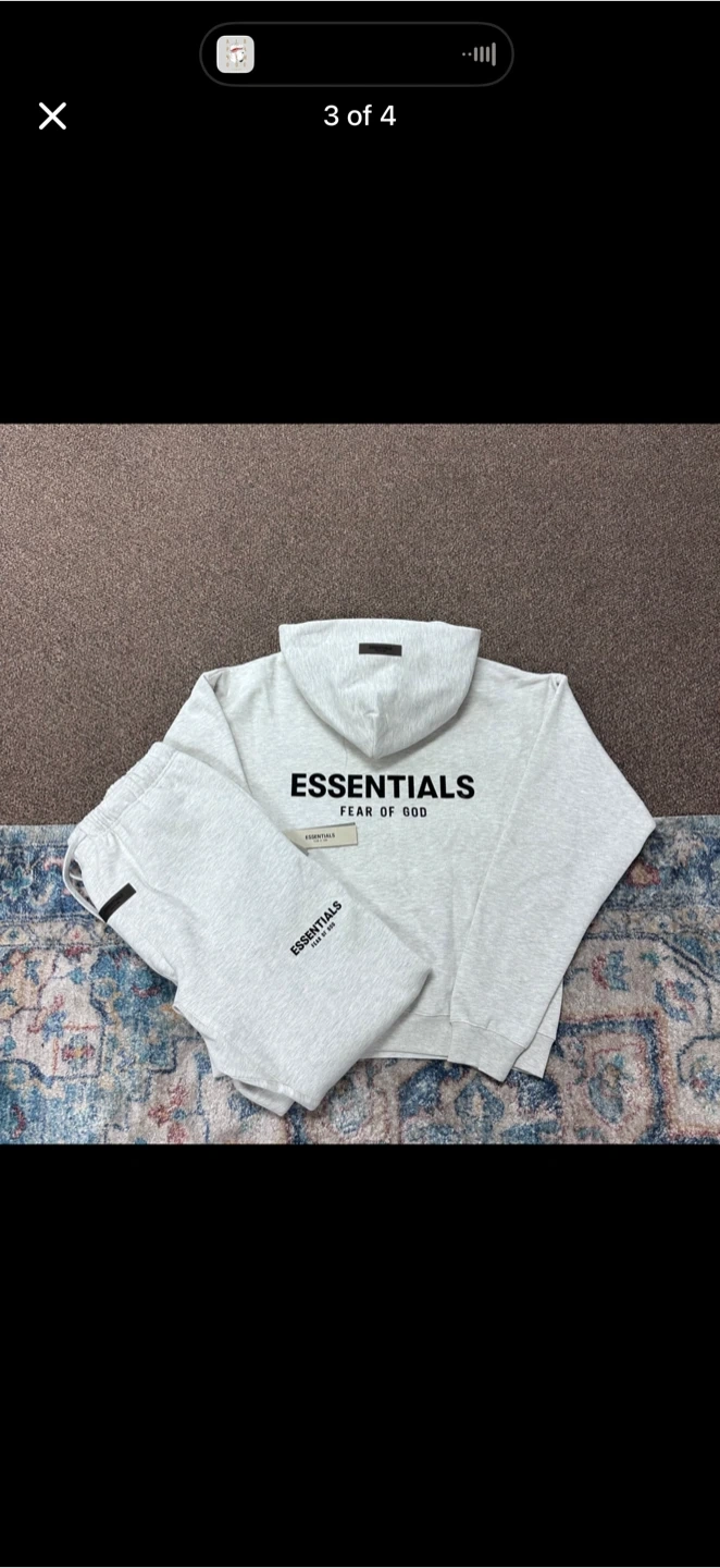 This is a Fear of God Essentials hoodie and sweatpants set in a heather grey colour. It's made from a soft, comfortable material, perfect for everyday wear. The set includes a hooded sweatshirt and matching sweatpants.