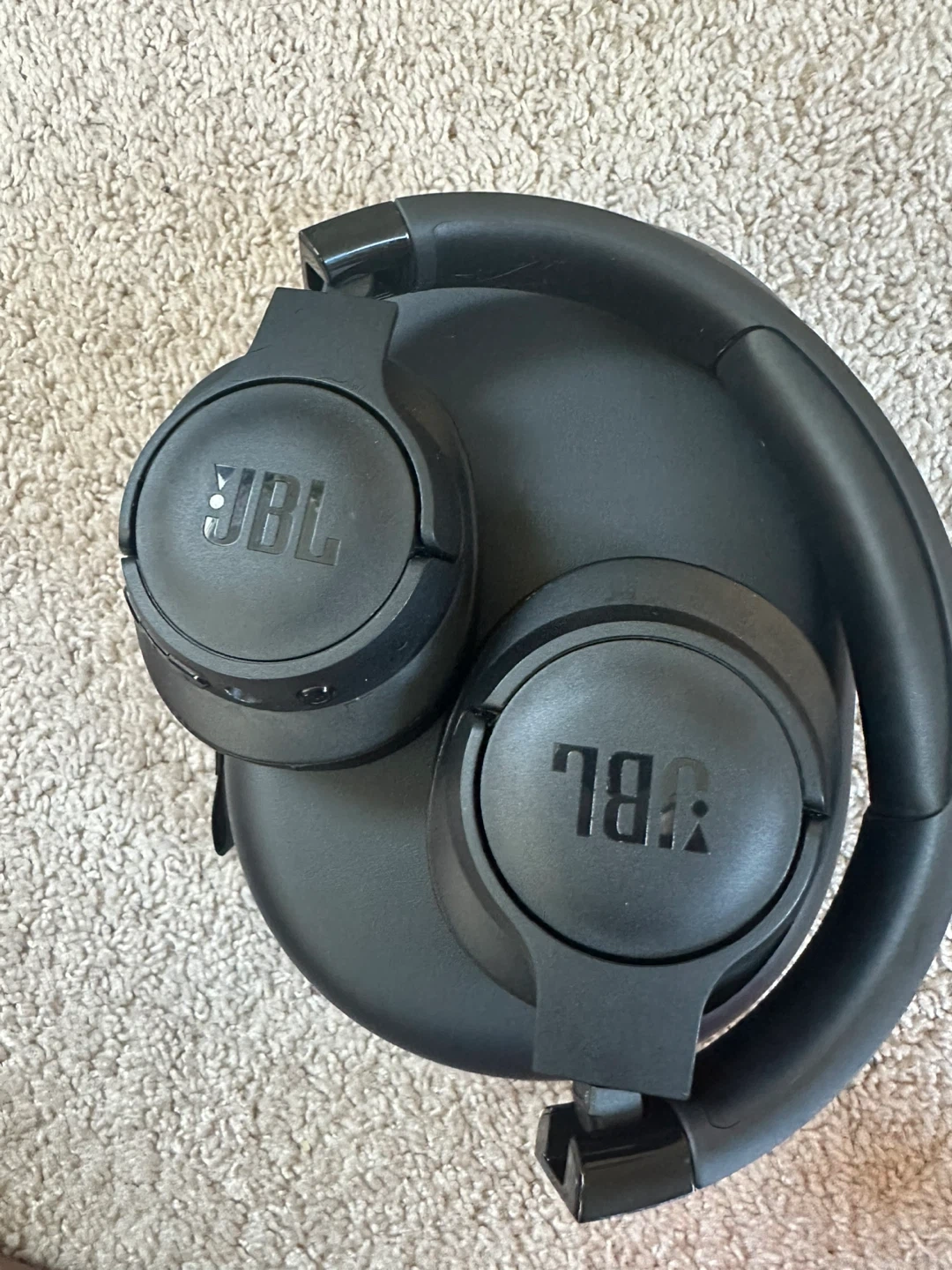 JBL over-ear headphones in black. They're comfortable and foldable. Includes left and right ear indicators.