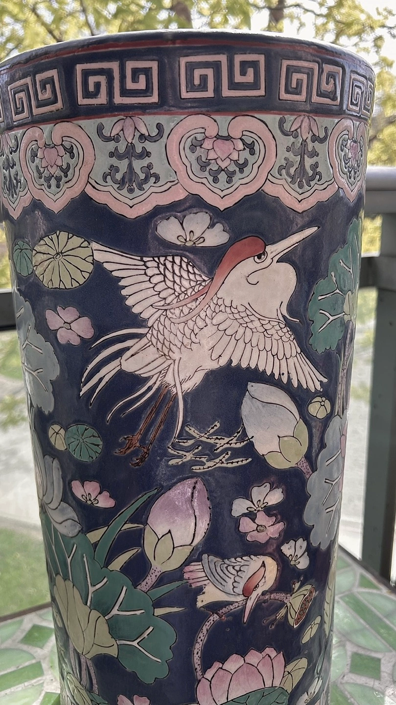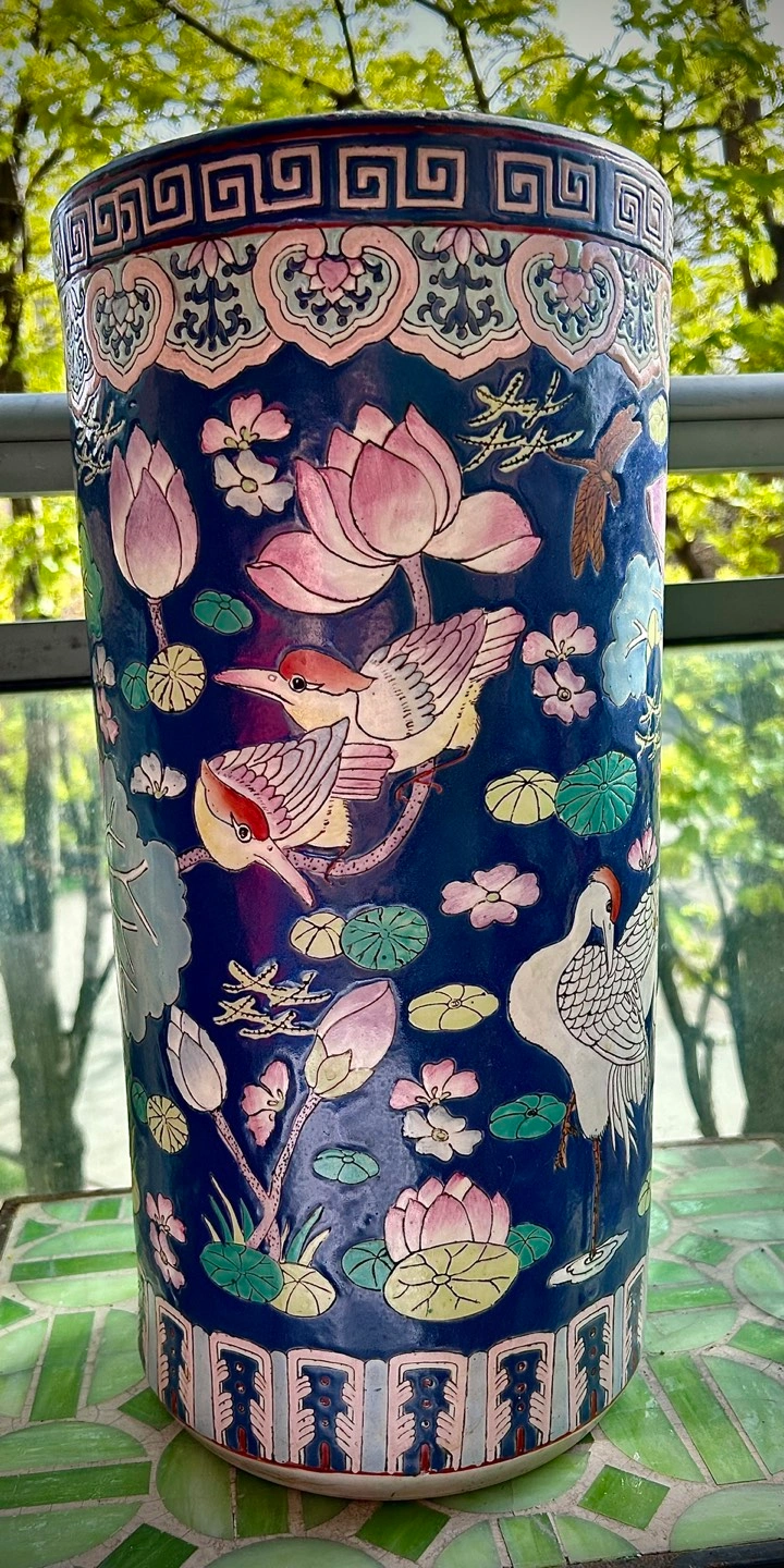 A lovely Asian-themed ceramic umbrella stand or large, tall vase.