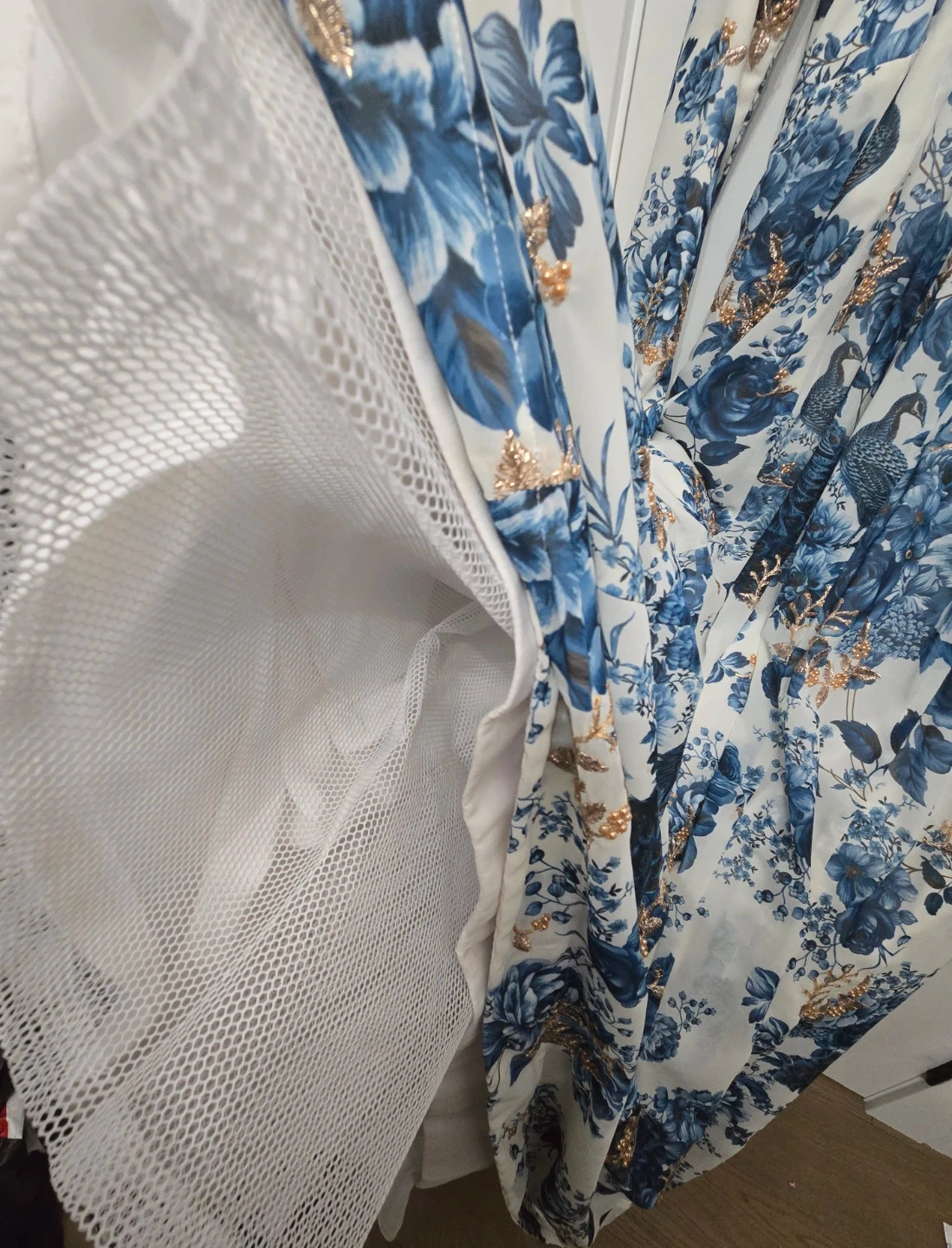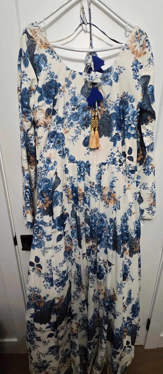 Beautiful dress featuring a lovely floral print in shades of blue and gold on a white background. It has long sleeves and a flowing skirt. There are also some blue and gold tassels at the back. Perfect for a special occasion or just feeling fancy!