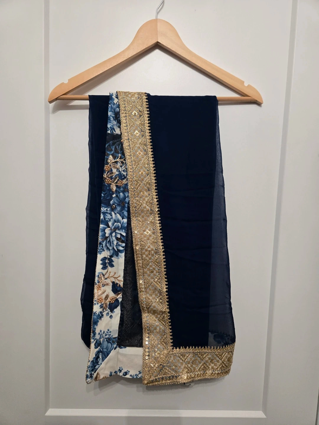 Beautiful dress featuring a lovely floral print in shades of blue and gold on a white background. It has long sleeves and a flowing skirt. There are also some blue and gold tassels at the back. Perfect for a special occasion or just feeling fancy!