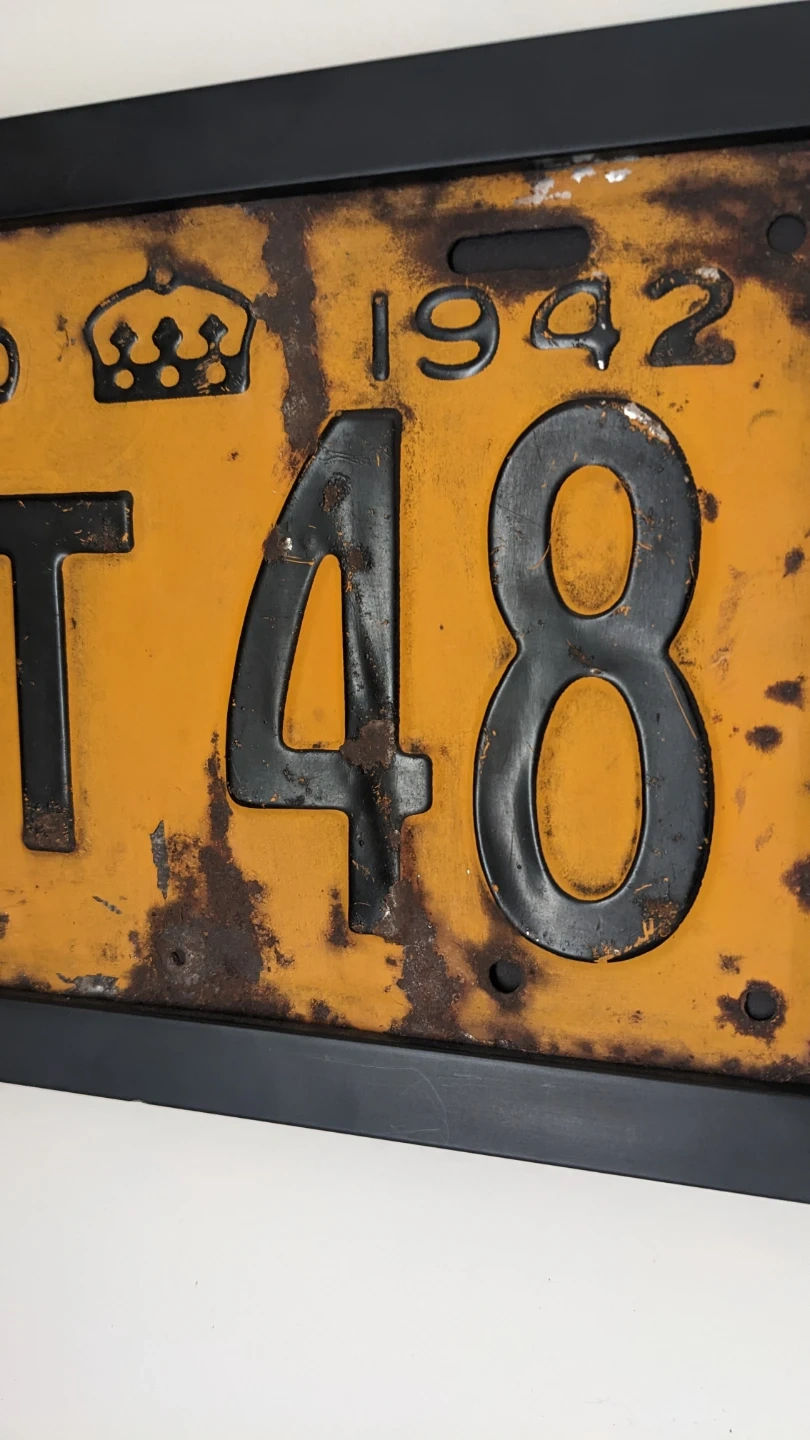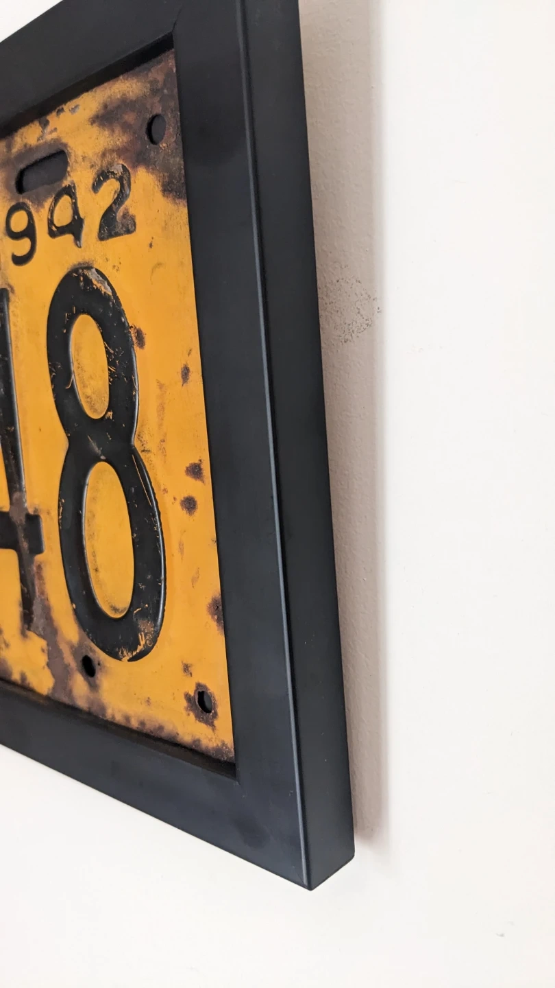 Vintage 1942 Ontario license plate framed as wall art. Features original numbering and patina. Framed in a black border.