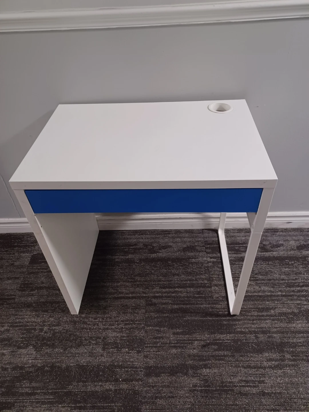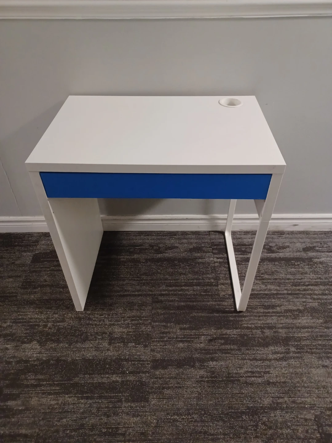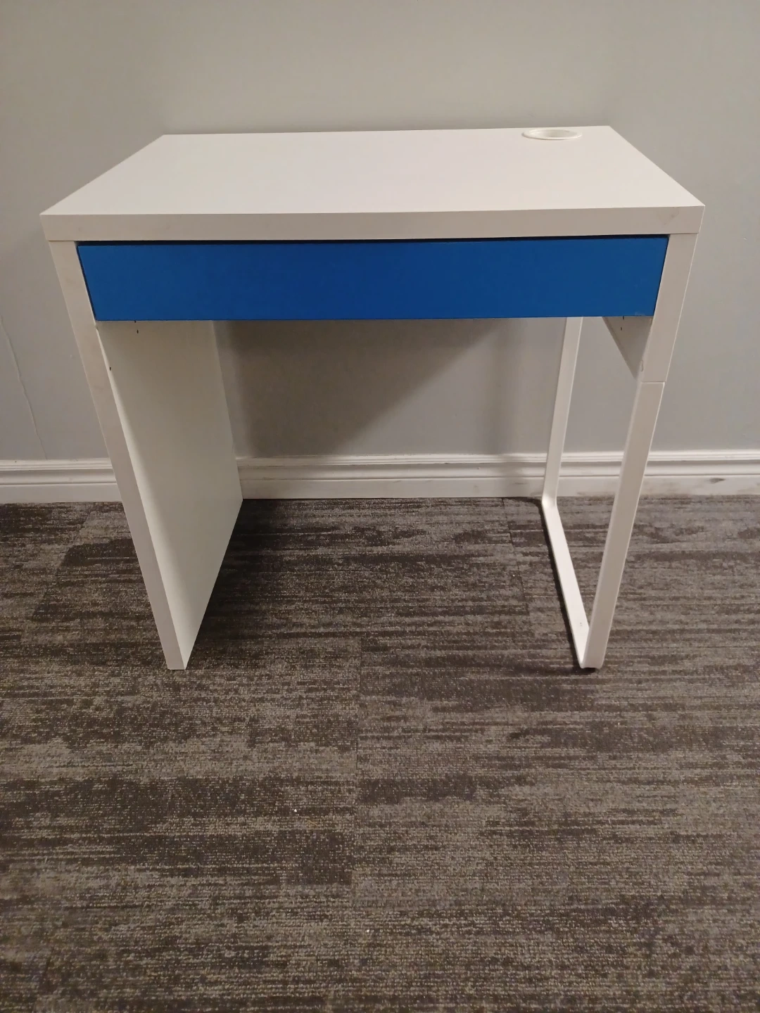 This desk has a clean white finish with a bright blue drawer front. It includes a single drawer for storage and a convenient cup holder on the desktop. It's perfect for a smaller workspace or a child's room. It's very clean without scratches.