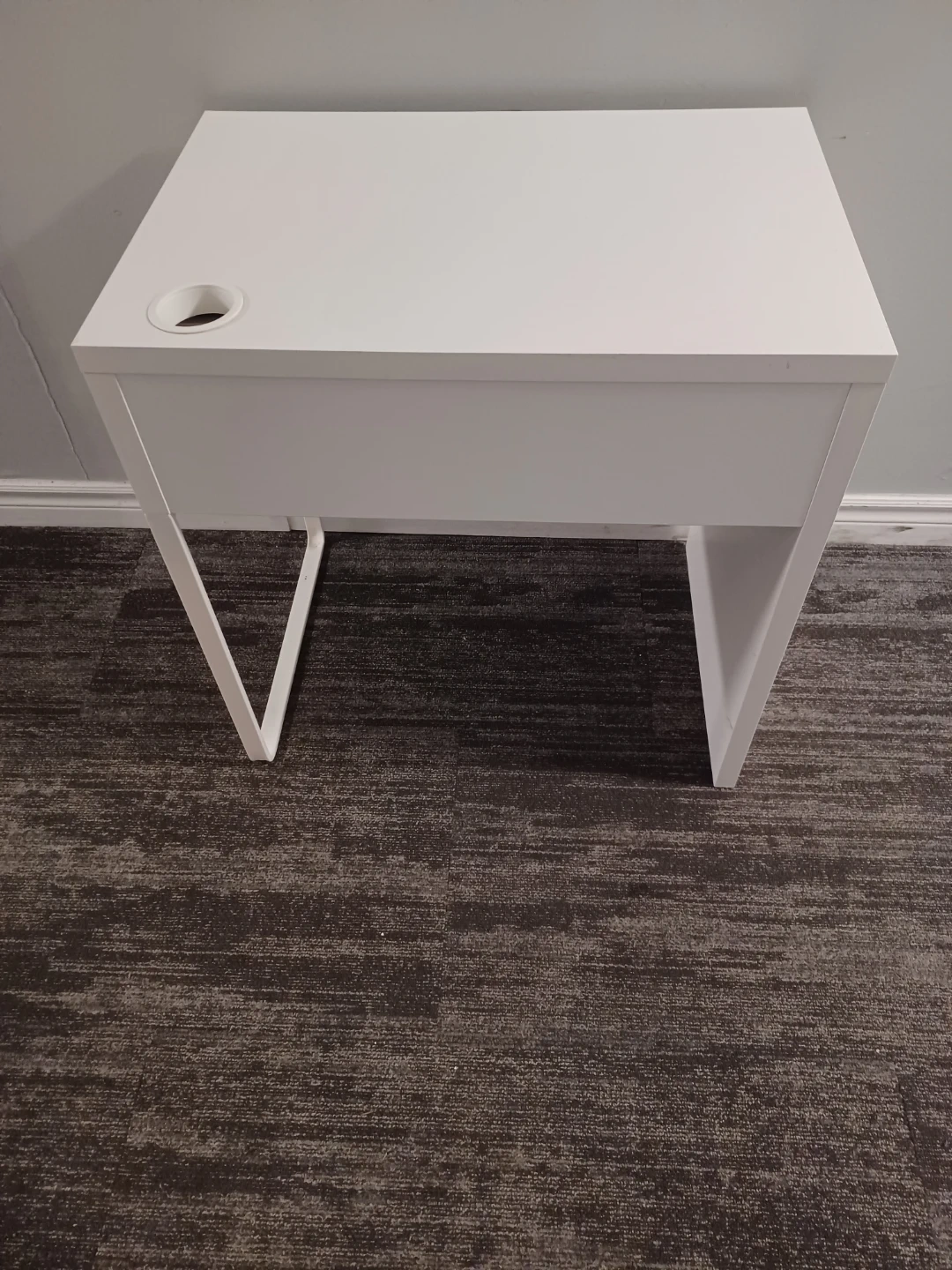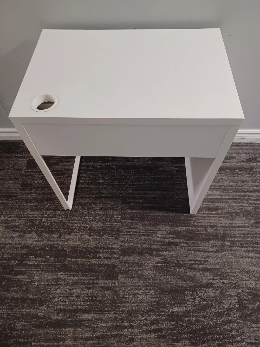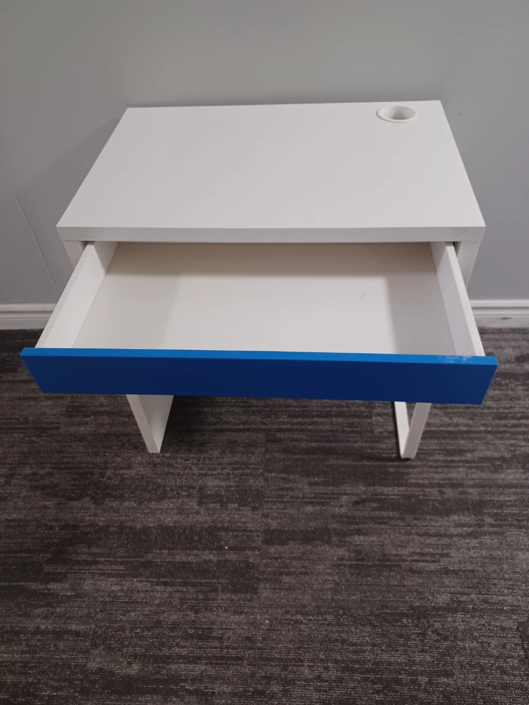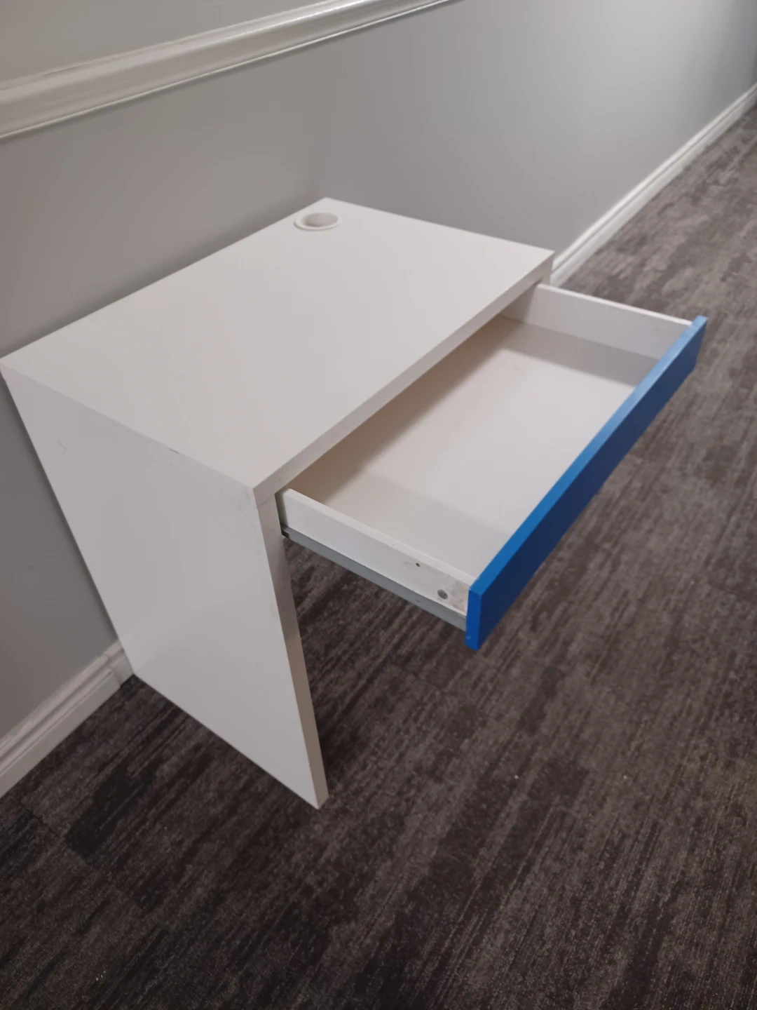 This desk has a clean white finish with a bright blue drawer front. It includes a single drawer for storage and a convenient cup holder on the desktop. It's perfect for a smaller workspace or a child's room. It's very clean without scratches.