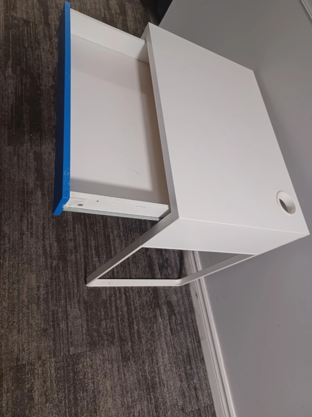 This desk has a clean white finish with a bright blue drawer front. It includes a single drawer for storage and a convenient cup holder on the desktop. It's perfect for a smaller workspace or a child's room. It's very clean without scratches.