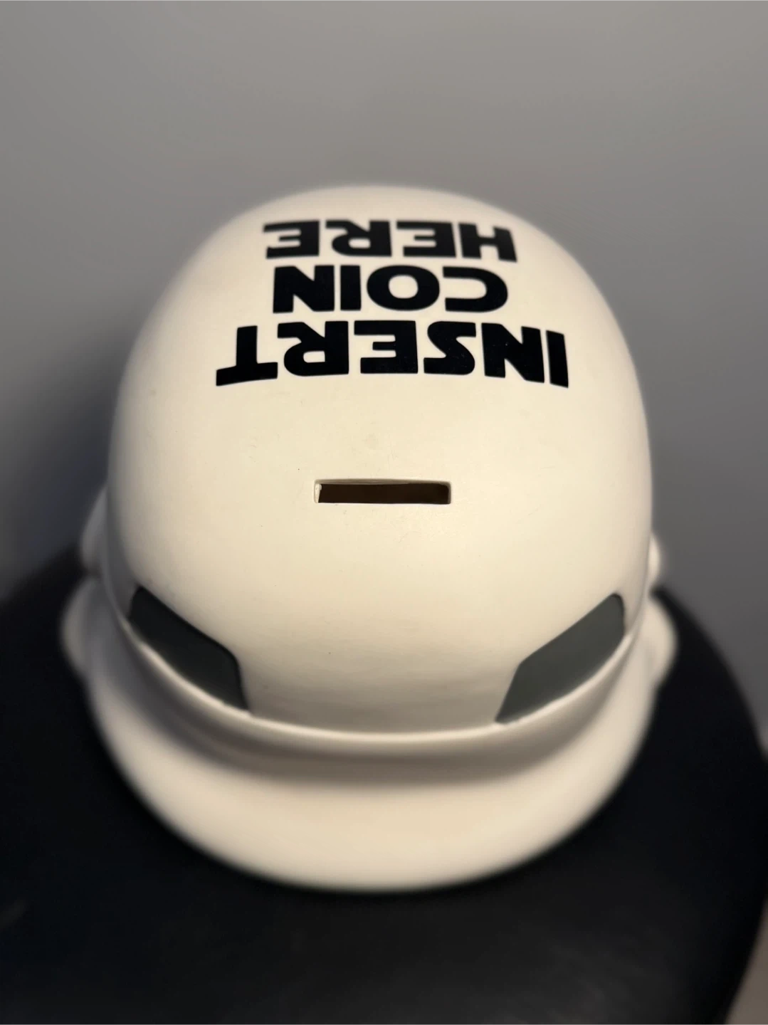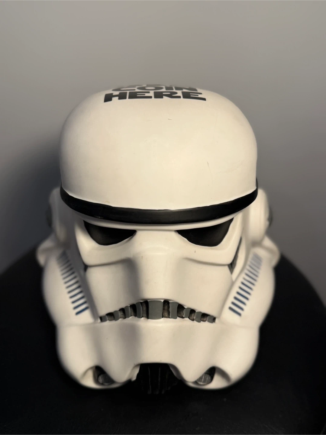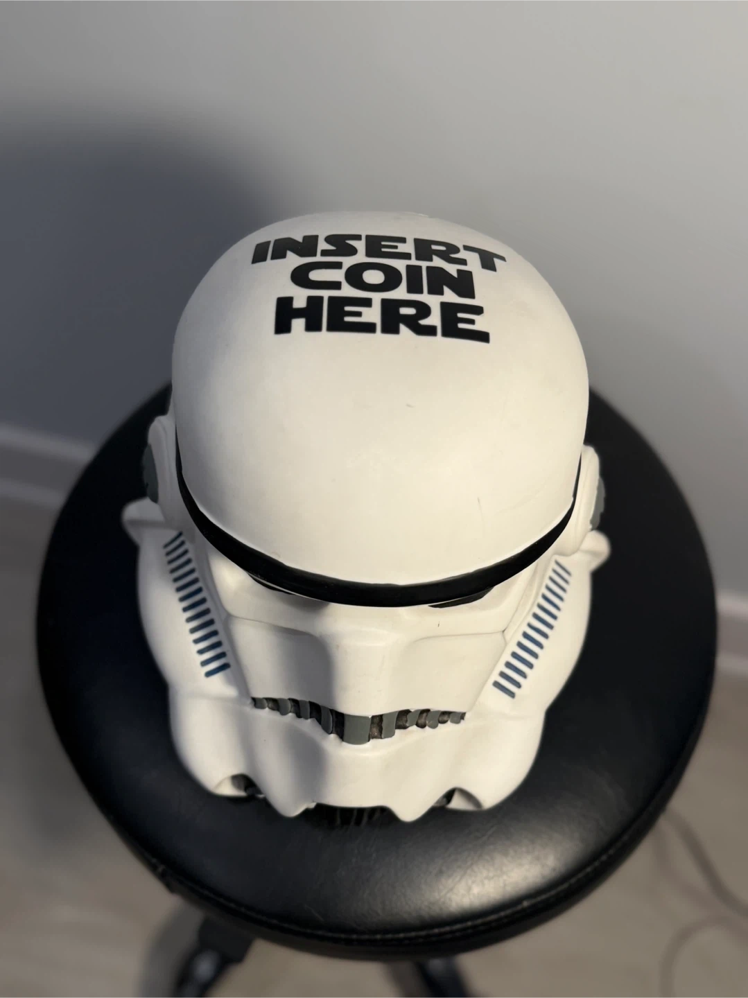 This is a Star Wars Stormtrooper helmet-shaped coin bank. It has "INSERT COIN HERE" printed on the top. A fun way to save your spare change!