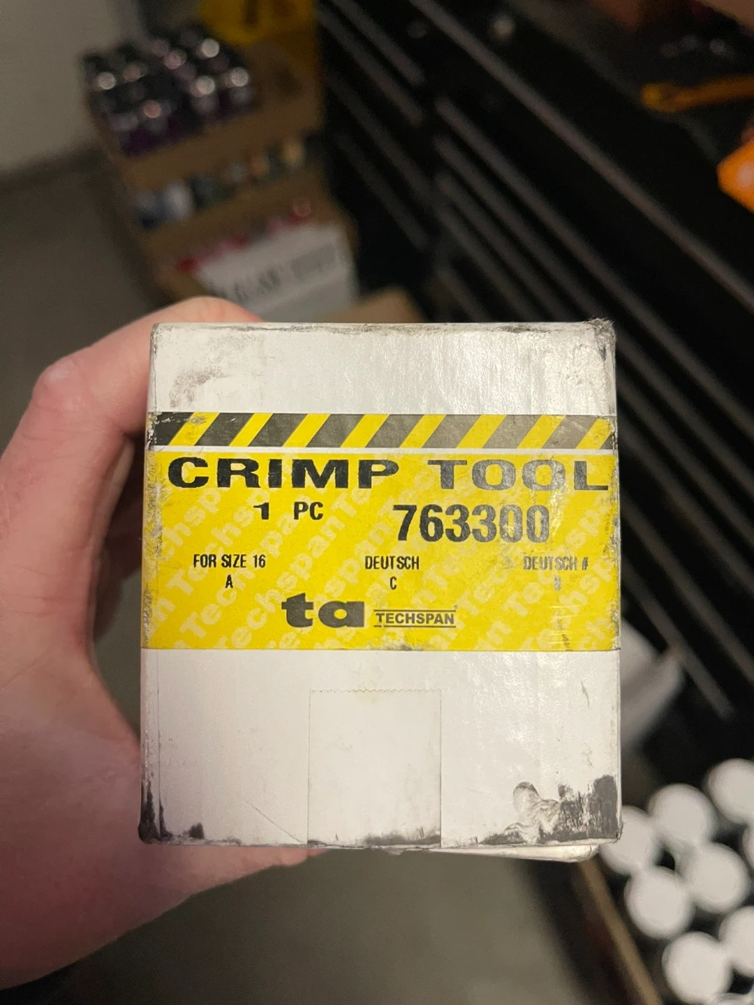 Brand new in box never used Deutsch crimp tool. Crimps all sizes of Deutsch connectors. A must in a mechanics or electricians tool set.