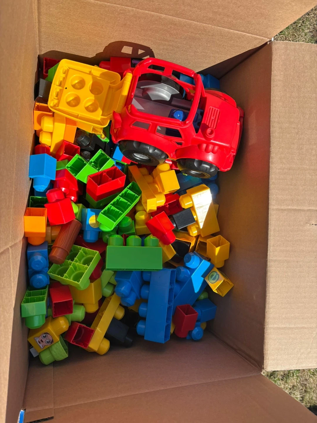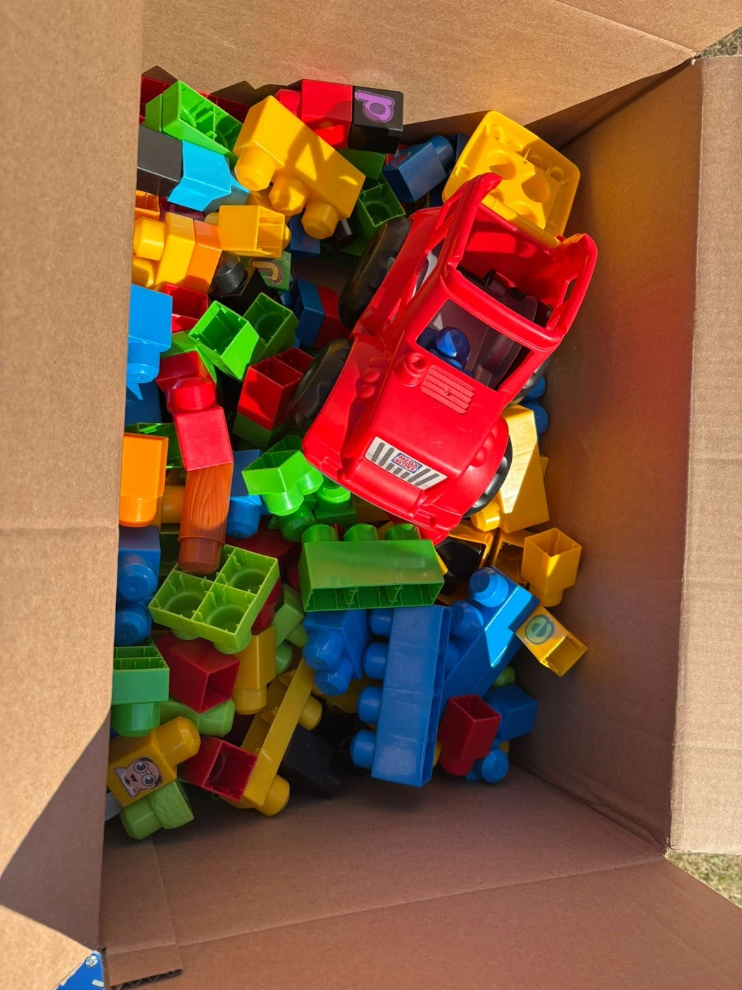 A large collection of colourful Mega Bloks building blocks and a red Mega Bloks truck. Perfect for little builders to create and play with!