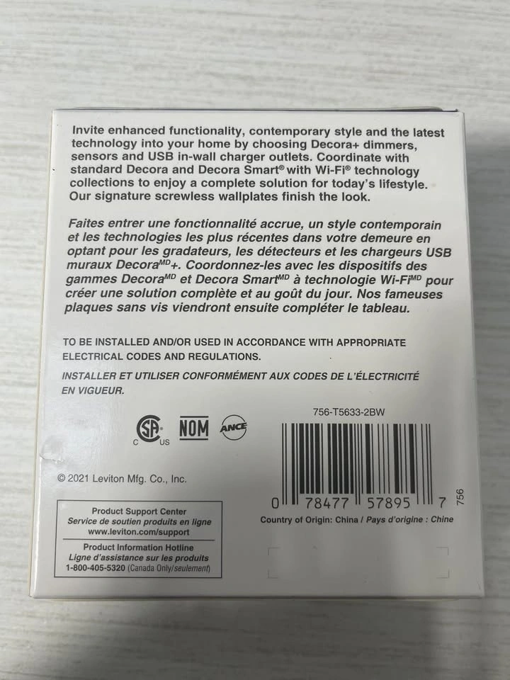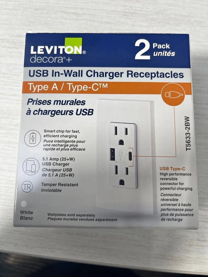 Brand new in box. Model: T5633-2BW. Retail price was $46.90+ tax. Selling for $40. Pickup is at Islington and Rexdale in Etobicoke. Please call or message at [hidden information]. Cash only. SMART – Built-in smart chip recognizes the individual device’s charging requirements to optimize the charge (Does not provide Power Delivery. See Leviton T5635). POWERFUL - Two high-powered charging ports deliver a combined total of 5.1A charging current and 25+ watts of power. CONVENIENT – No more searching for charging adapters! Upgrade so you can charge electronics leaving the outlets free for additional power needs. ENHANCED SAFETY – Built-in overcurrent protection helps protect electronics from receiving too much power, which can damage the device.
