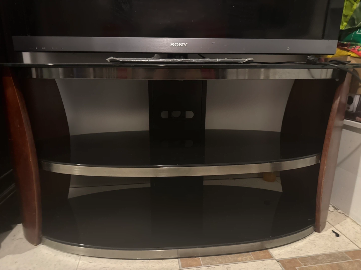 This TV stand features 3 curved slat shelves with a rich wood tone frame. It can hold up to 75 pounds. The stand also comes with a 2-3 year old Sony TV