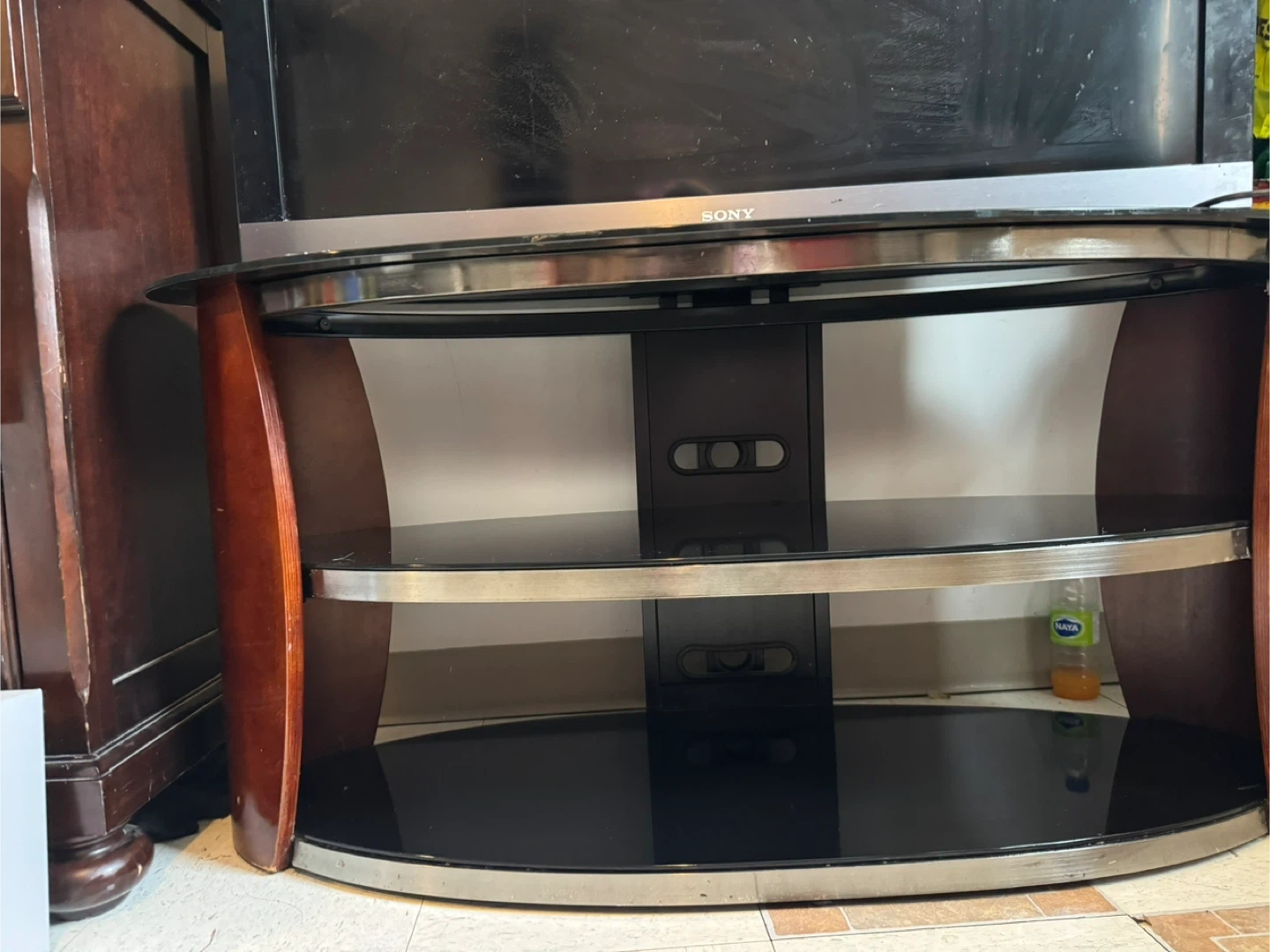 This TV stand features 3 curved slat shelves with a rich wood tone frame. It can hold up to 75 pounds. The stand also comes with a 2-3 year old Sony TV
