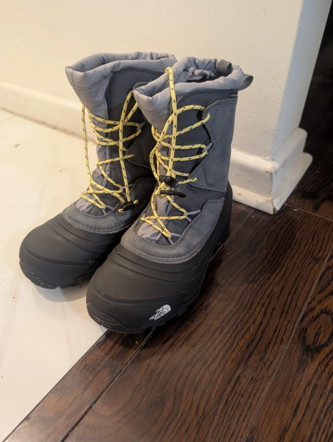 These grey and black winter boots are from The North Face. They feature a durable waterproof construction with warm fleece lining and yellow laces. Excellent for keeping feet warm and dry during cold weather!