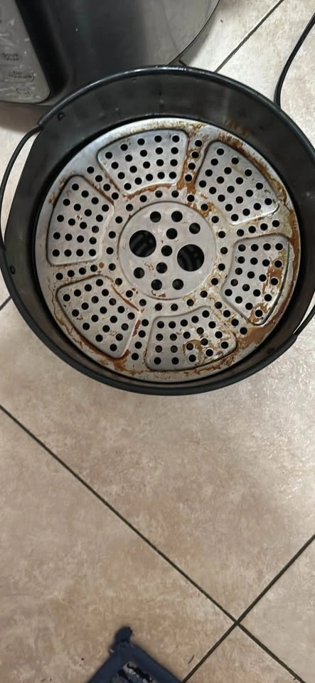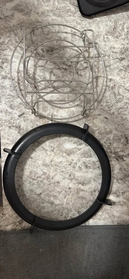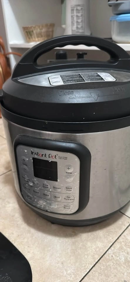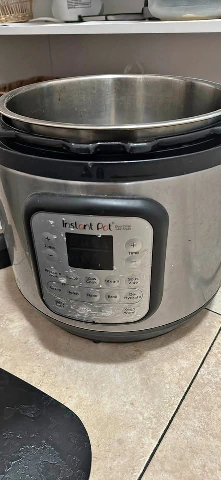 Versatile Instant Pot Duo Crisp + Air Fryer with stainless steel inner pot. Functions include pressure cook, air fry, roast, bake, broil, and more. Super handy for quick meals! Comes with all accessories and is working perfectly. Selling because I'm moving back to India.