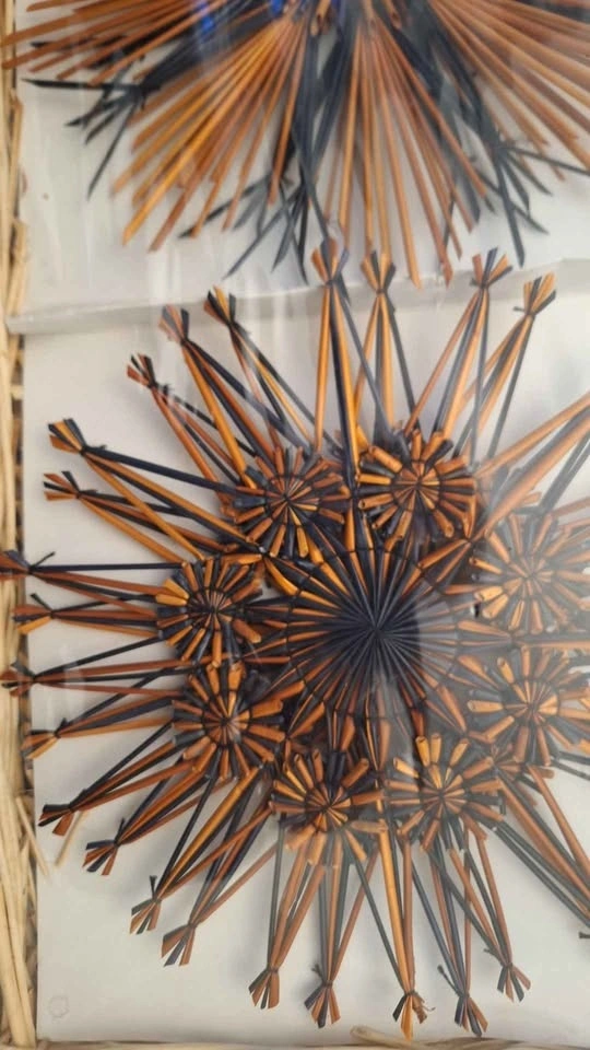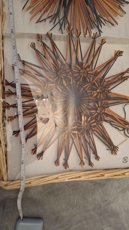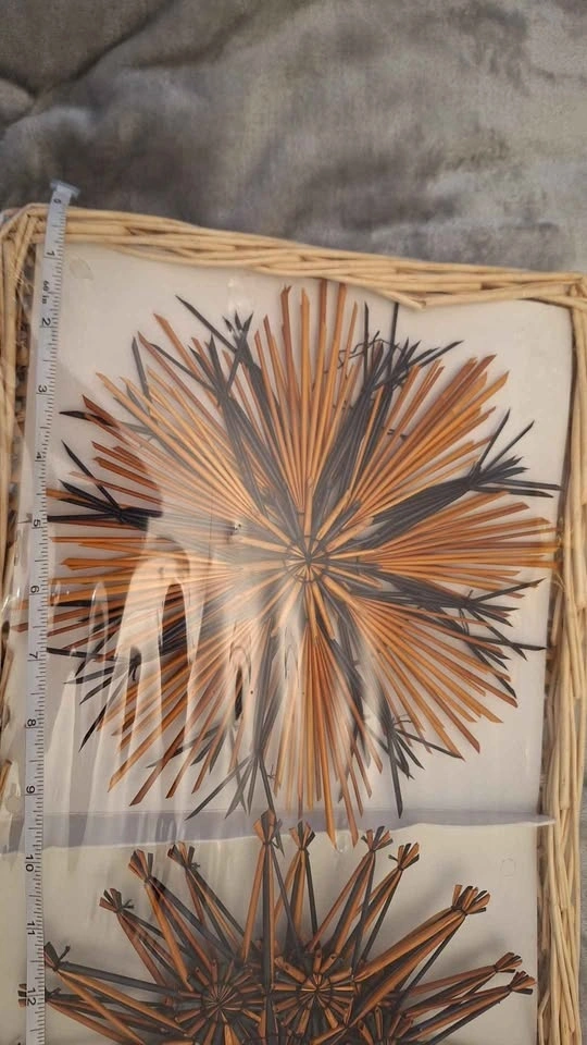 Beautiful decorative starburst artworks. Made from folded paper or cardstock in shades of orange and black. Arranged on a white background and framed in a natural wicker frame. Wrapped in plastic.