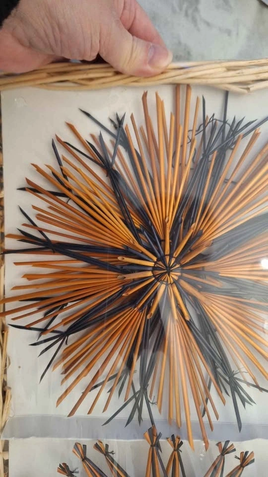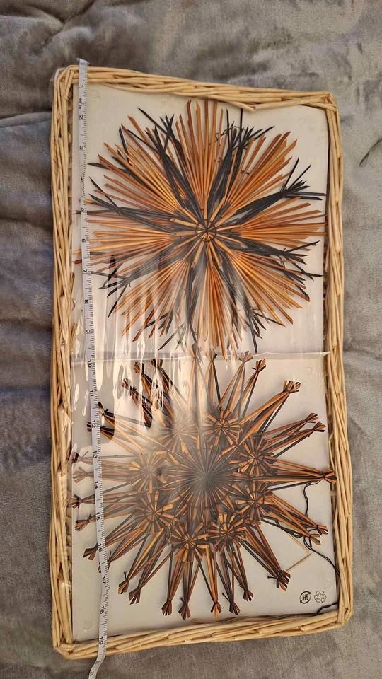 Beautiful decorative starburst artworks. Made from folded paper or cardstock in shades of orange and black. Arranged on a white background and framed in a natural wicker frame. Wrapped in plastic.