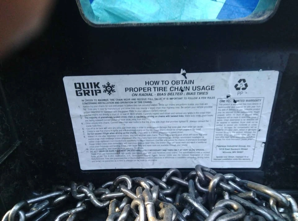 Durable Quik Grip tire chains. Three sets available. Only used three times. Two sets are heavy duty. Asking $500 for all three sets or best offer. Can also do $200 per set.