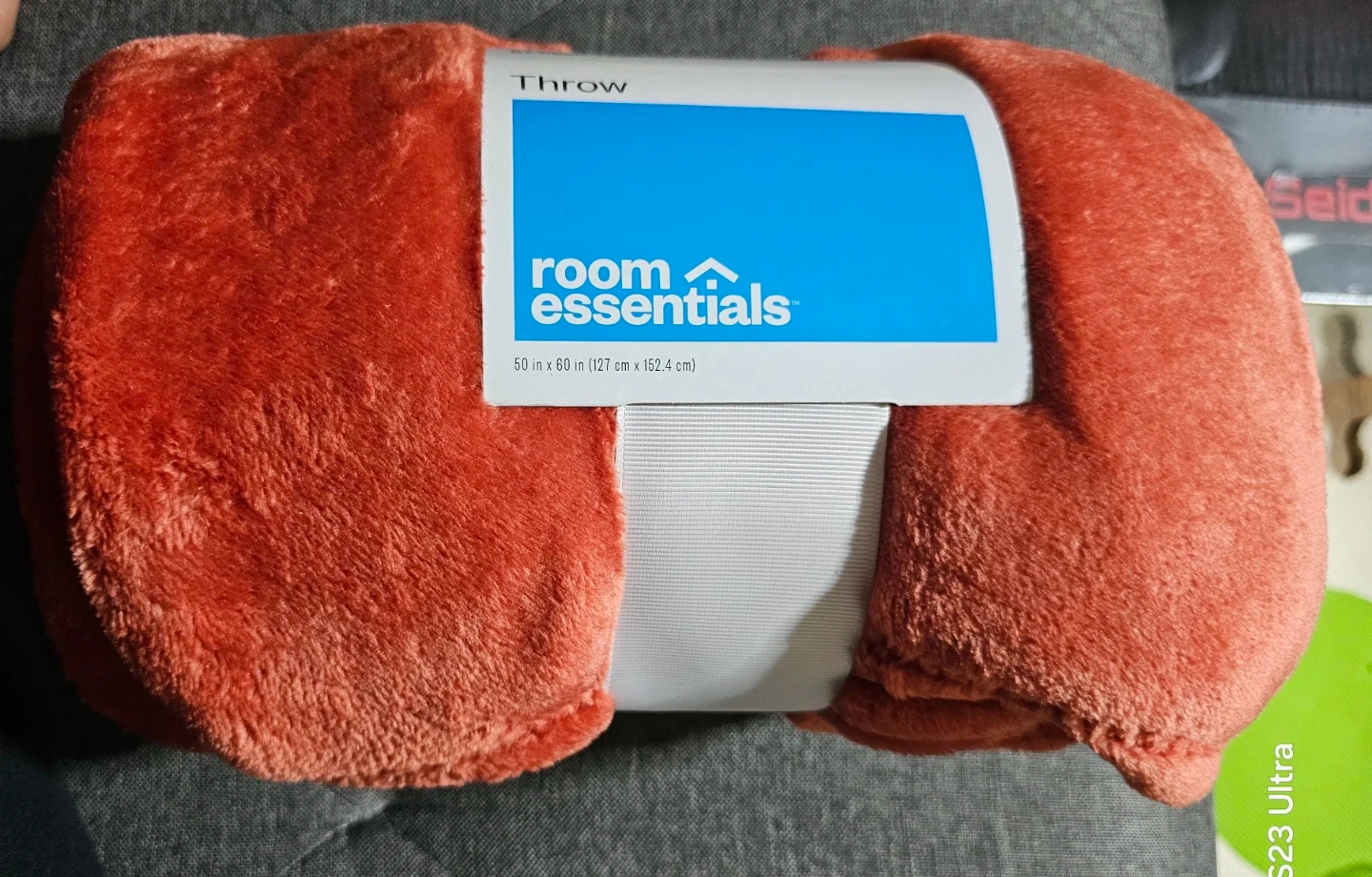 Snuggle up with this Room Essentials solid plush blanket! It's a vibrant orange and measures 50 inches by 60 inches. Made with 100% recycled polyester, it's soft and cozy. It's easy to care for: just machine wash cold on a normal cycle and tumble dry low