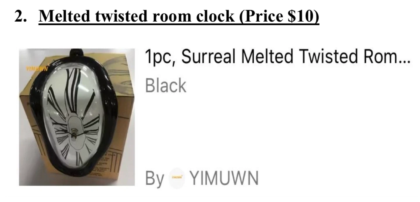 - A surreal, melted, twisted room clock in black.