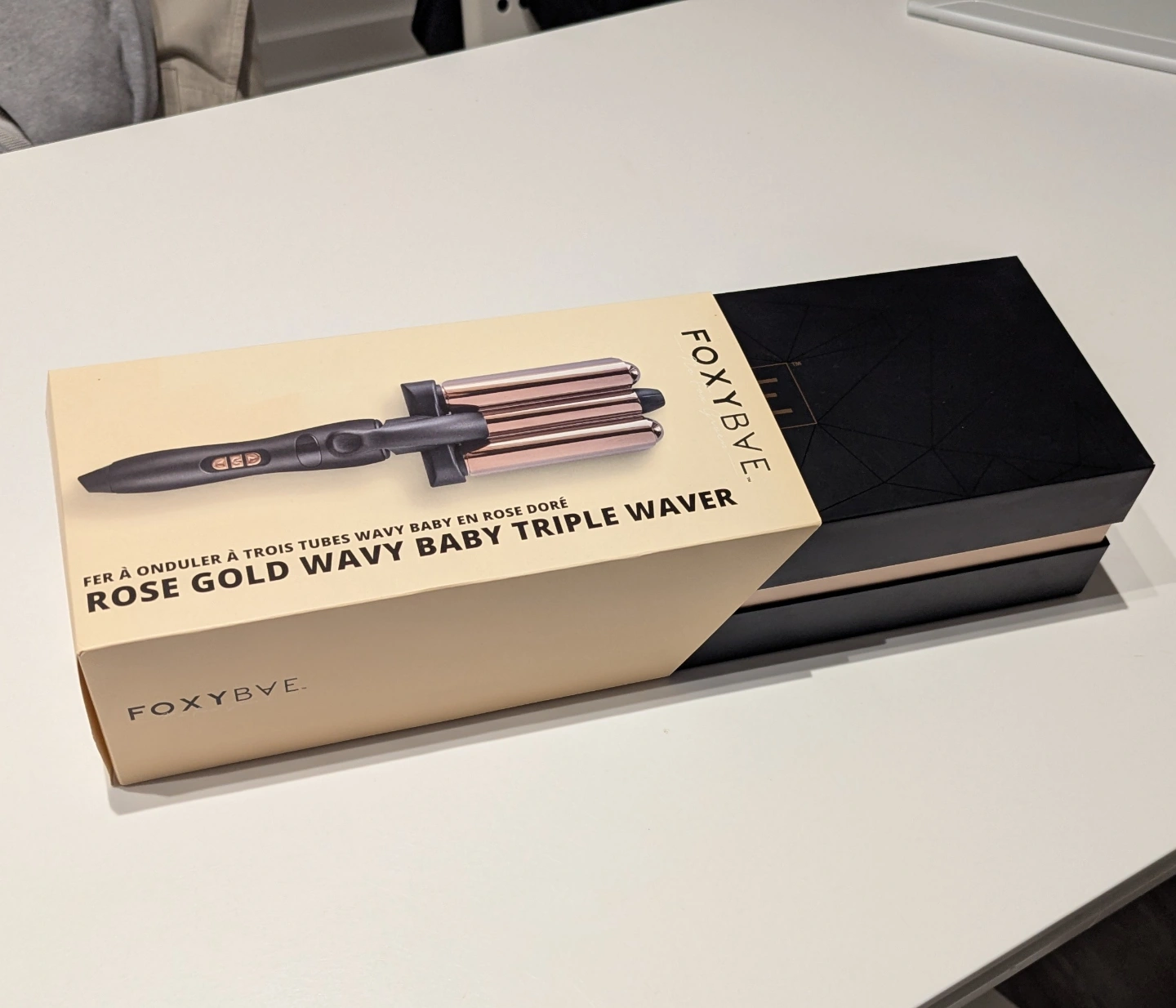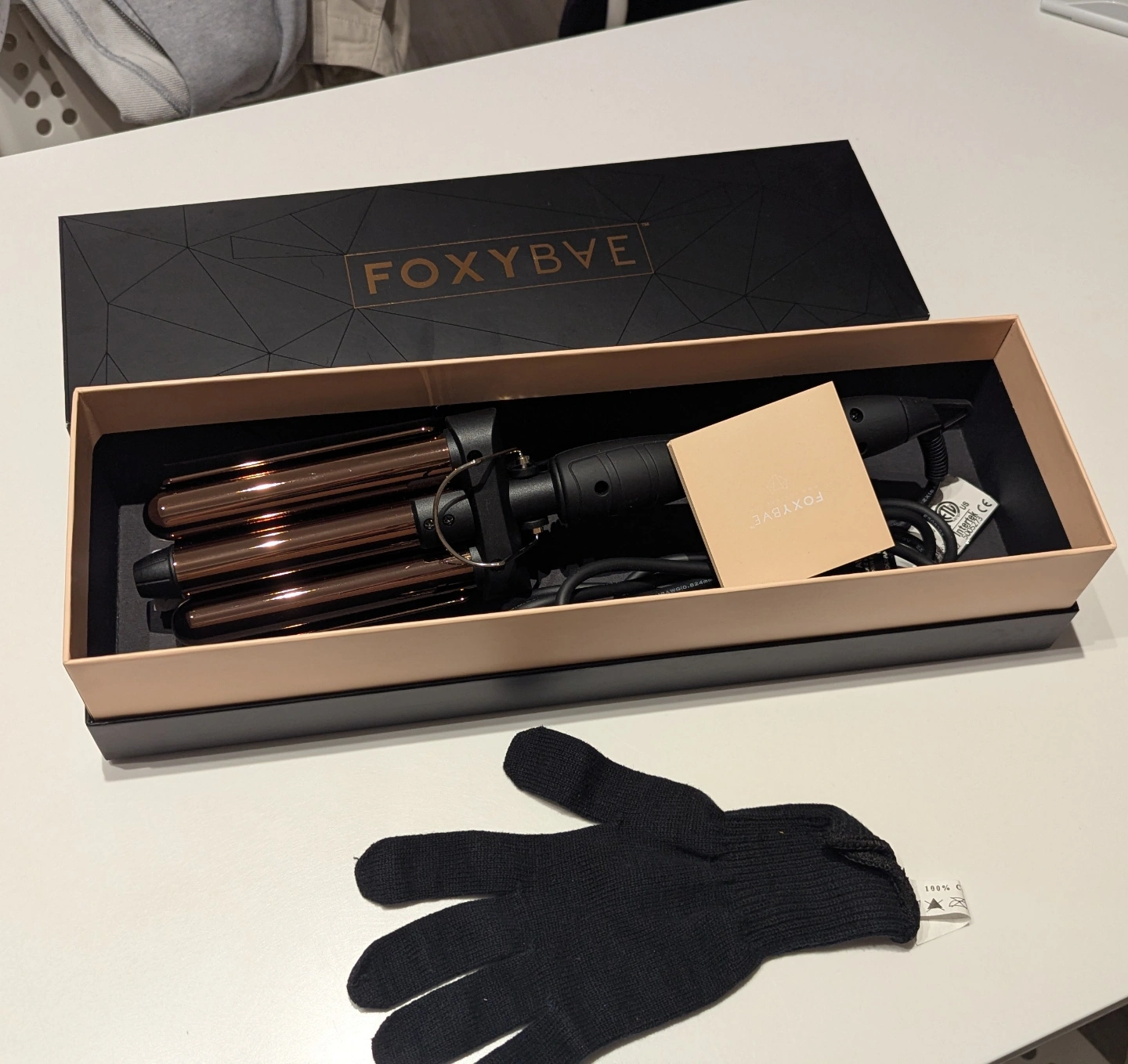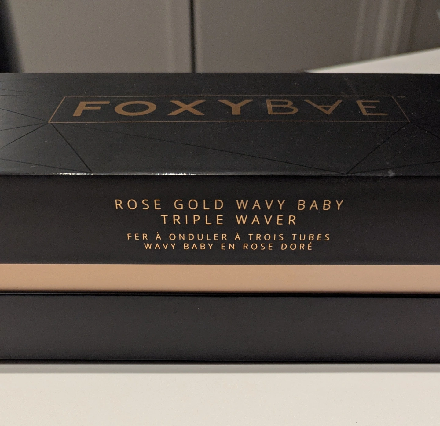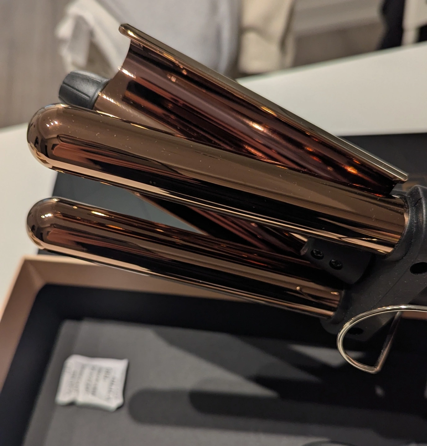 A rose gold triple waver. It comes in its original box, along with a heat-resistant glove.