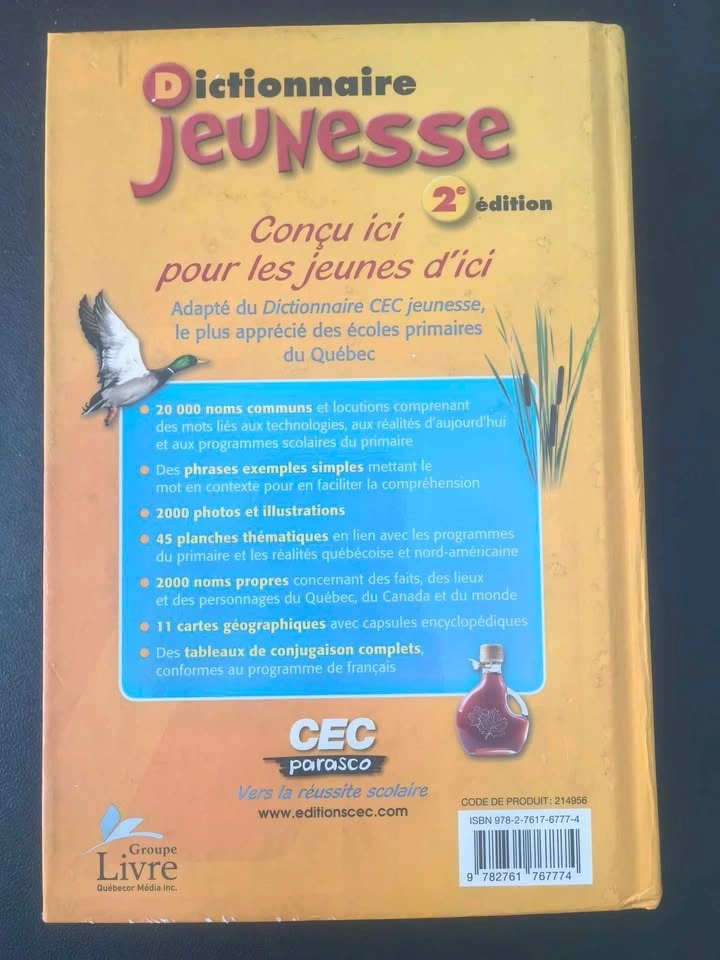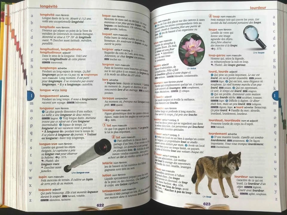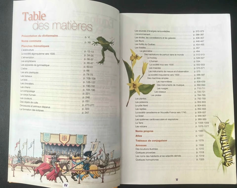 20,000 common nouns and phrases, 2,000 photos and illustrations, 45 thematic plates, 2,000 proper nouns relating to facts, places, and people, 11 maps with encyclopedic entries, complete conjugation tables