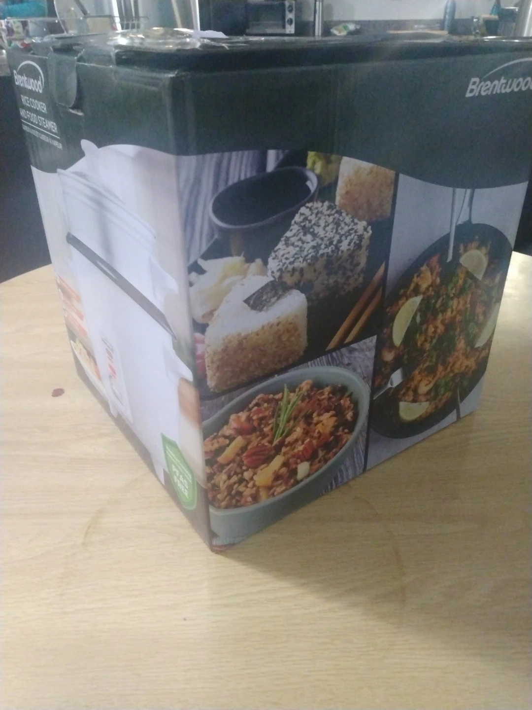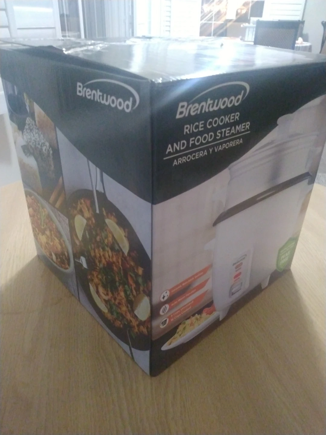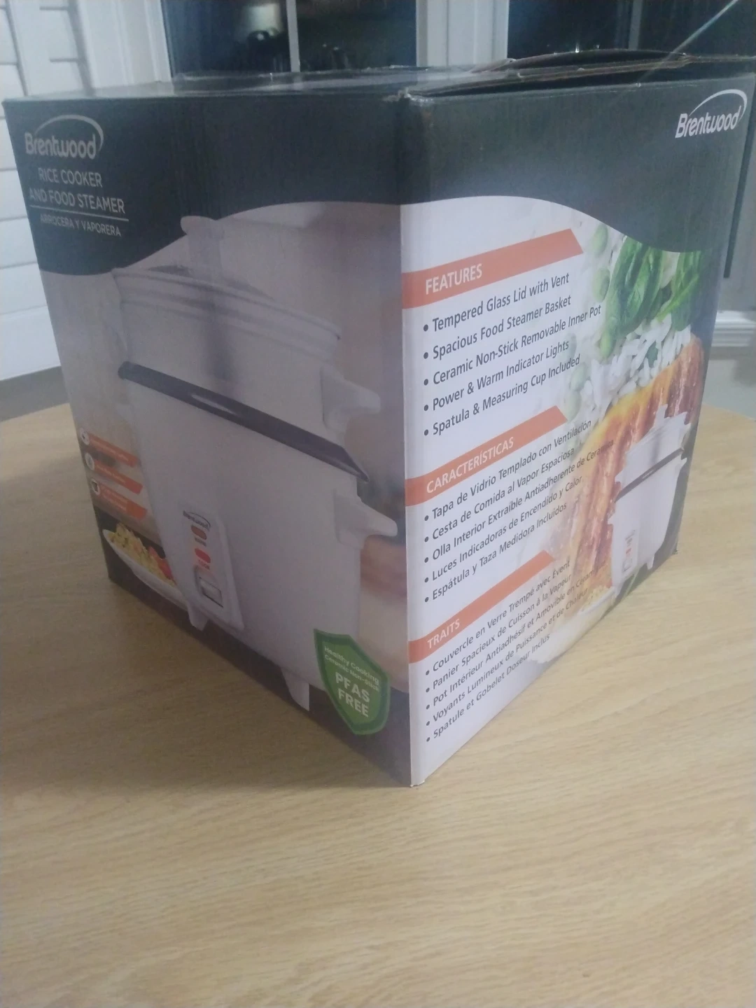 I'm selling a brand new Brentwood rice cooker and food steamer! It comes in the original box and includes a tempered glass lid with a vent, a spacious food steamer basket, and a ceramic non-stick removable inner pot. It also has power and warm indicator lights, plus a spatula and measuring cup are included too.