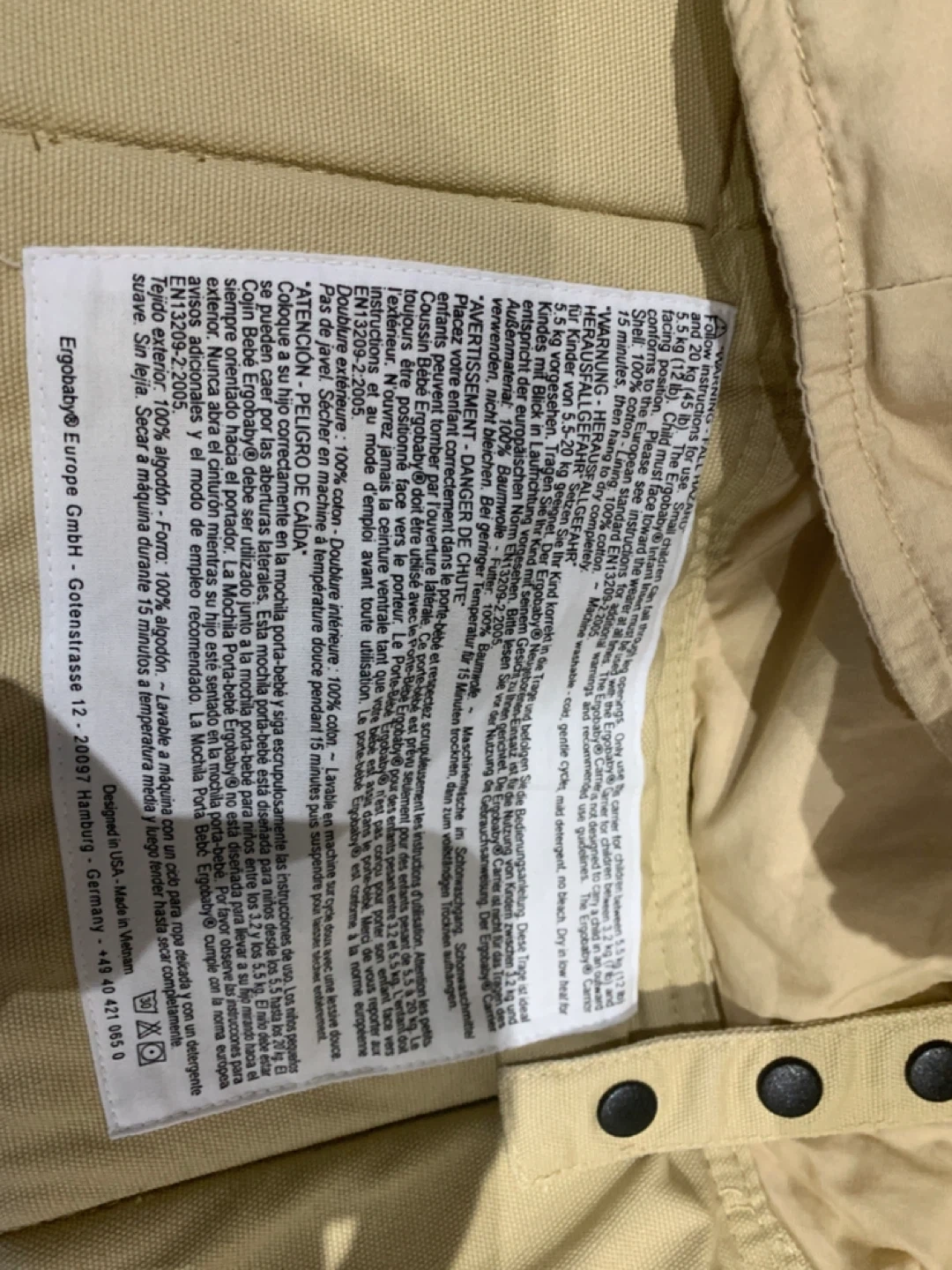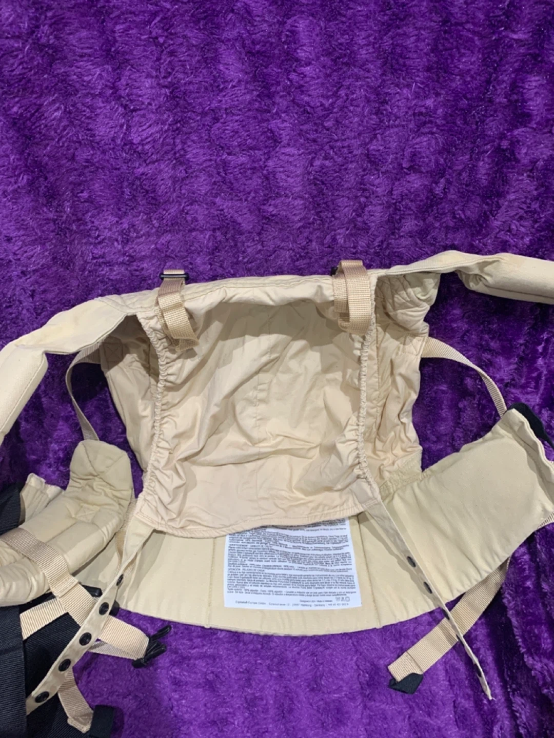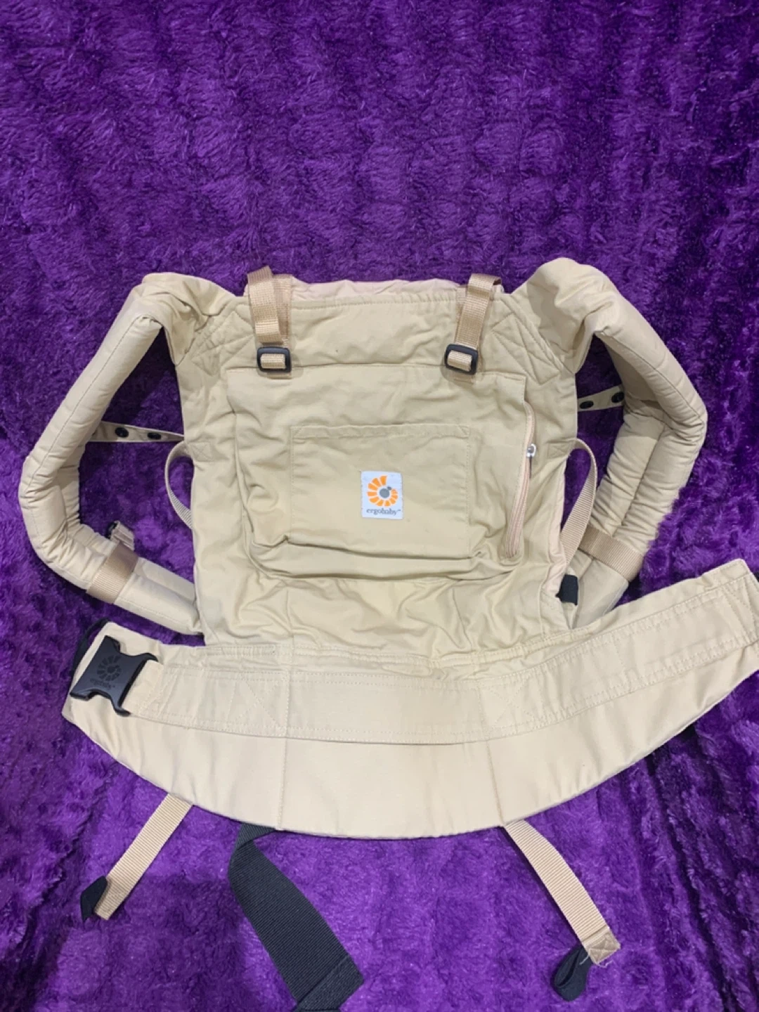 Ergobaby baby carrier in a light tan colour. It's made from 100% cotton. Supports babies from 5.5-45 lbs (2.5-20.4 kg). This carrier is great for hands-free carrying while out and about.