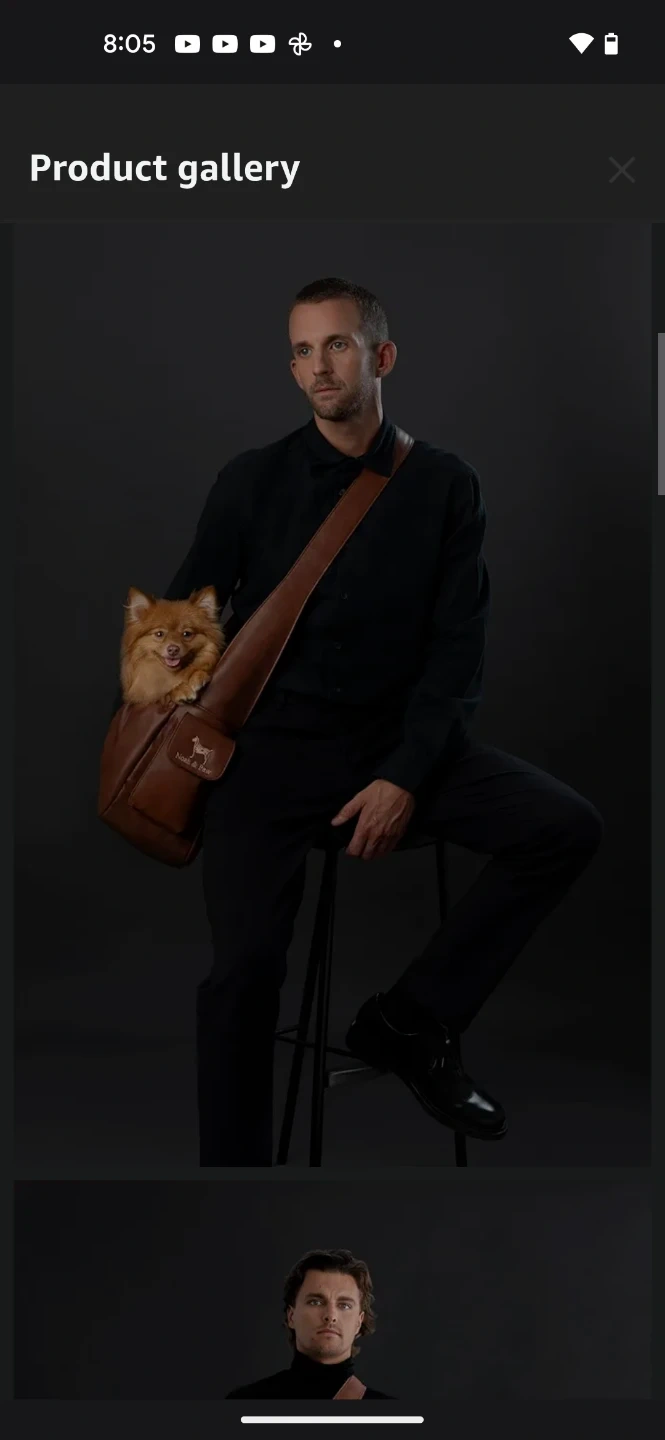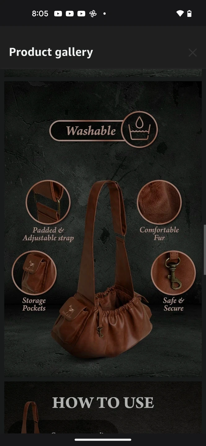 This NOAH & PAW dog sling carrier is designed for small to medium dogs. It's brown, washable, and features a padded adjustable strap, comfortable fur lining, and storage pockets. It's safe and secure for your pet!