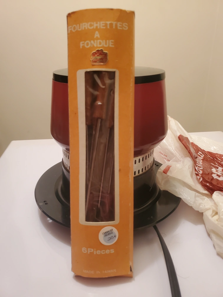 Selling a vintage fondue set, complete with 6 forks! It's in good condition and ready for your next fondue night.