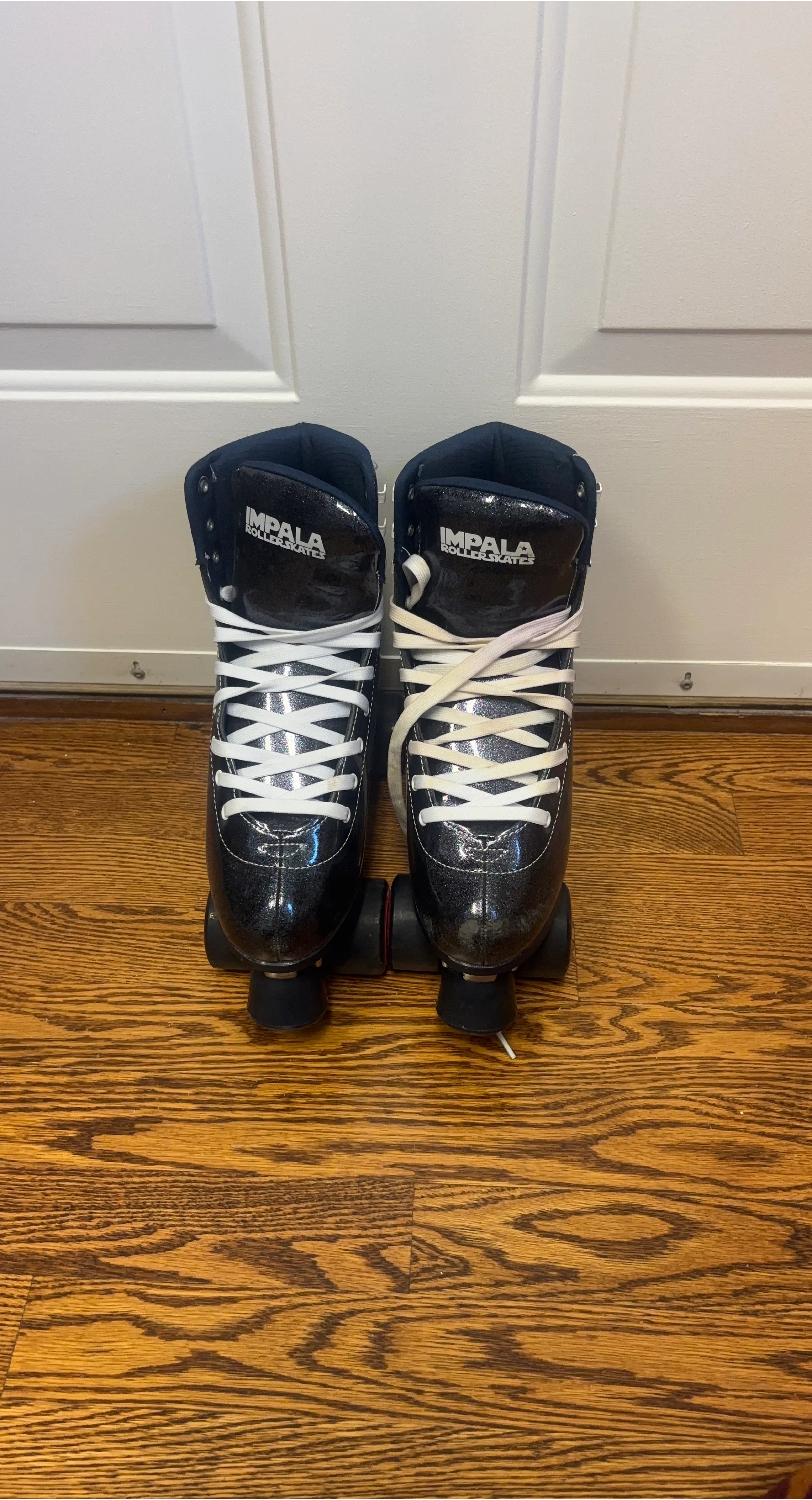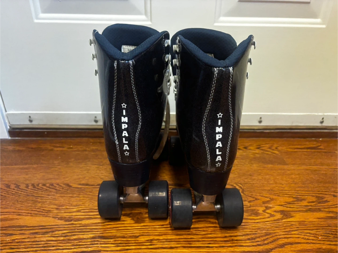 Impala roller skates in a black sparkle finish. These skates have white laces and black wheels. They're designed for comfort and style on the rink or boardwalk.