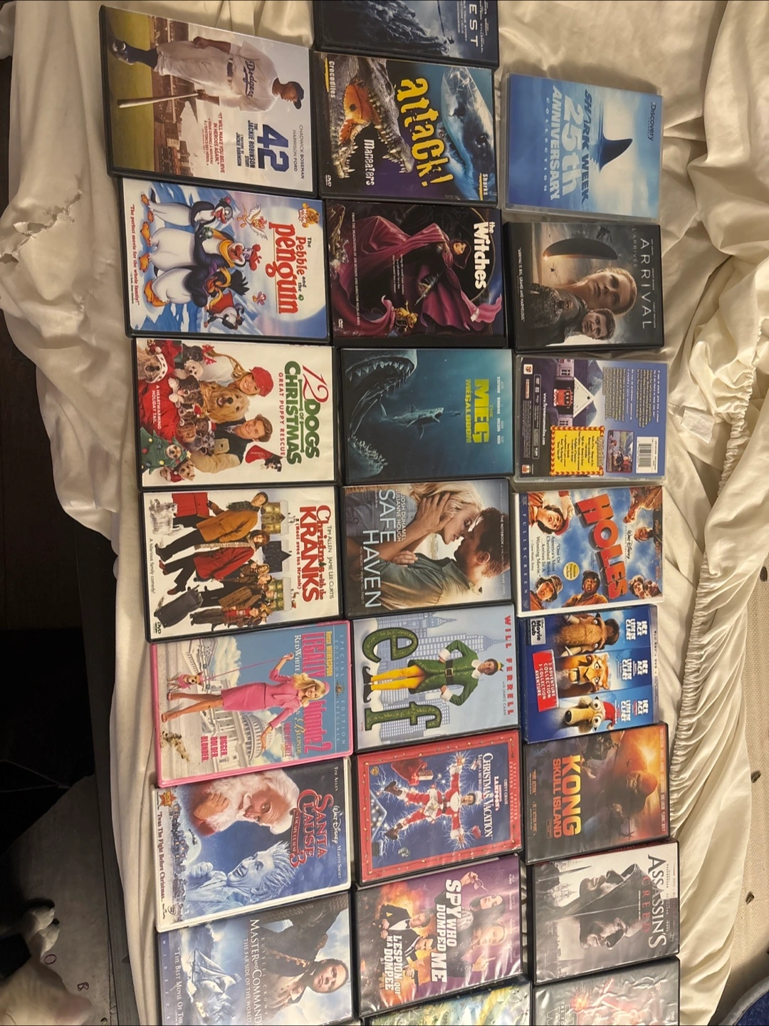 Selling a collection of DVDs, including titles like 42, Attack!, Shark Week 25th Anniversary, Arrival, The Witches, and MEG. Also includes family favourites like The Pebble and the Penguin, 12 Dogs of Christmas, Elf, and Christmas Vacation. Something for everyone!