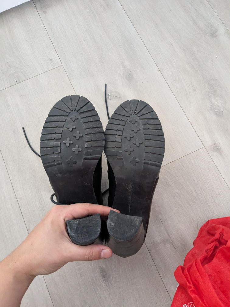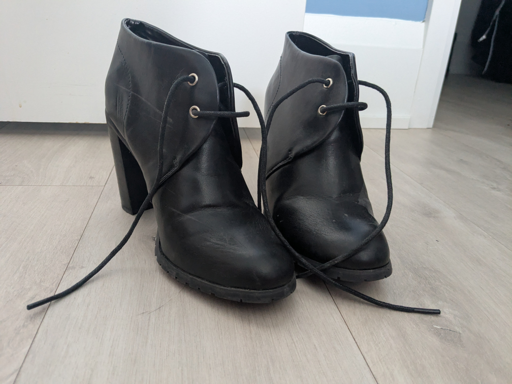 Selling a pair of vegan leatherblack heeled ankle boots in size 8. Only worn once, they have a thick supportive 3 inch heel and lace-up detailing. Perfect for adding a bit of edge to any outfit!