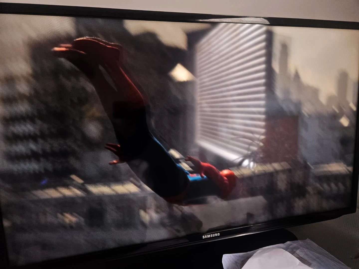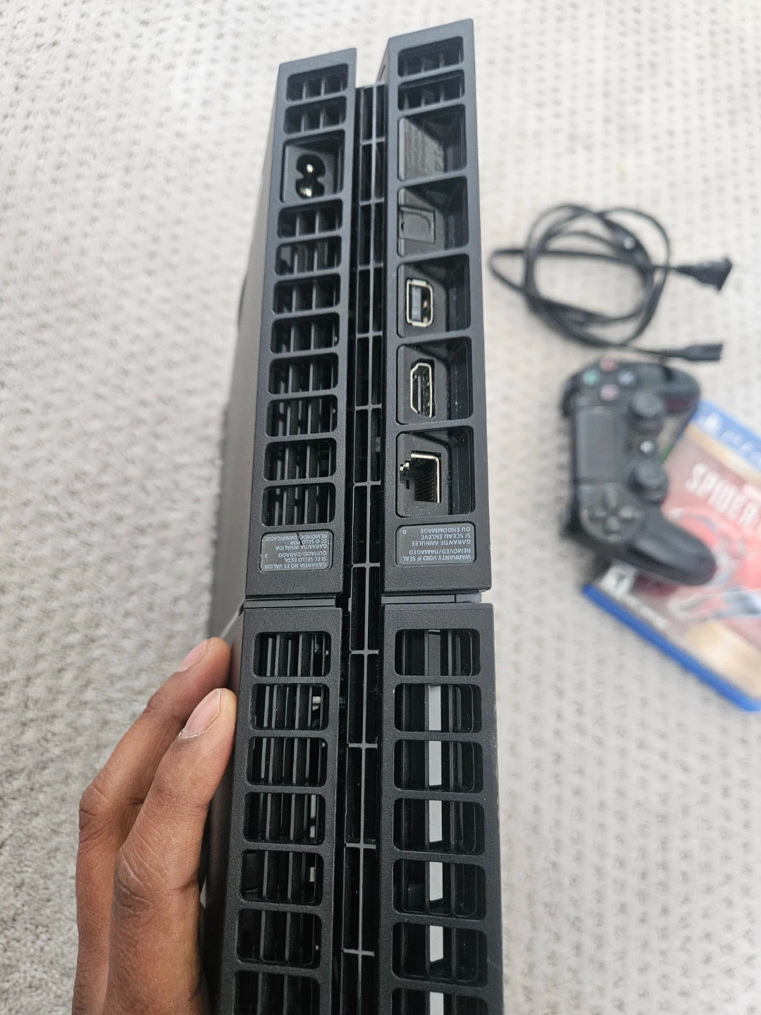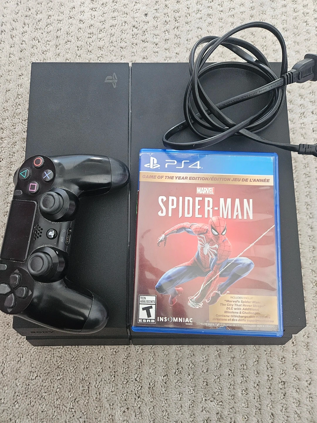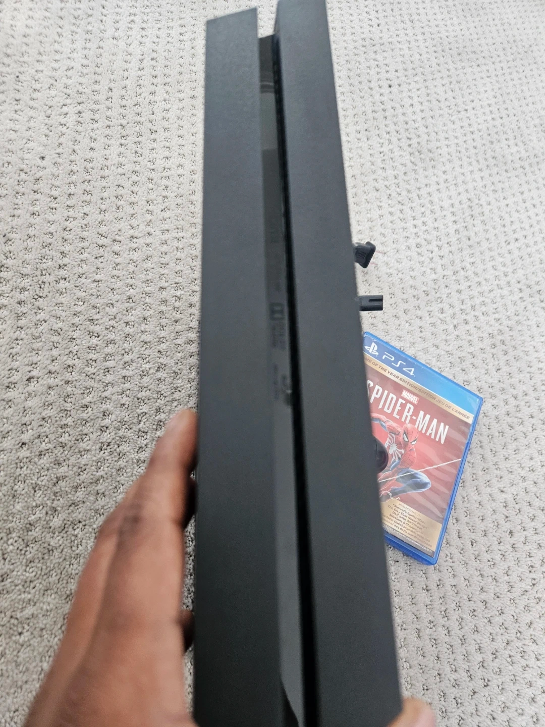 This is a Sony PlayStation 4 Slim console. It comes with the Spider-Man video game and a controller. The console is black.
