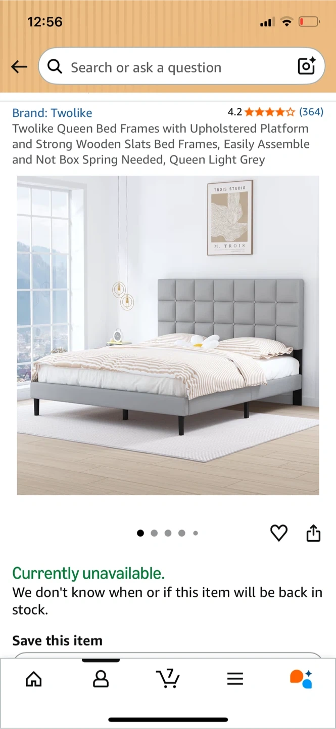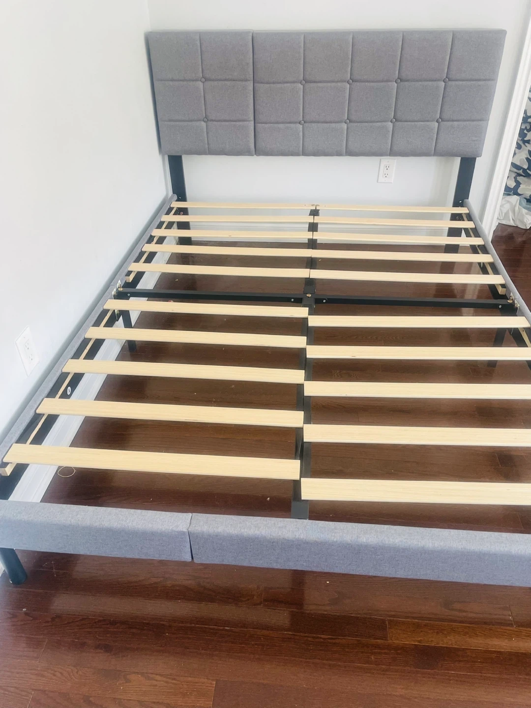 This is a Twolike queen bed frame with upholstered platform and strong wooden slats. It offers 7.5" of underbed storage space. Assembly is easy and no box spring is needed. Used only for two months.