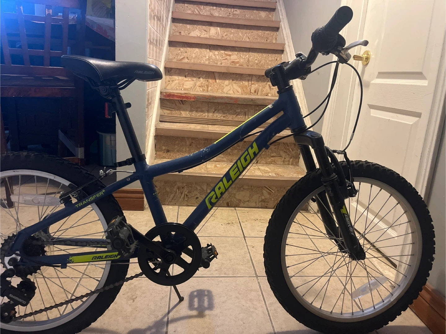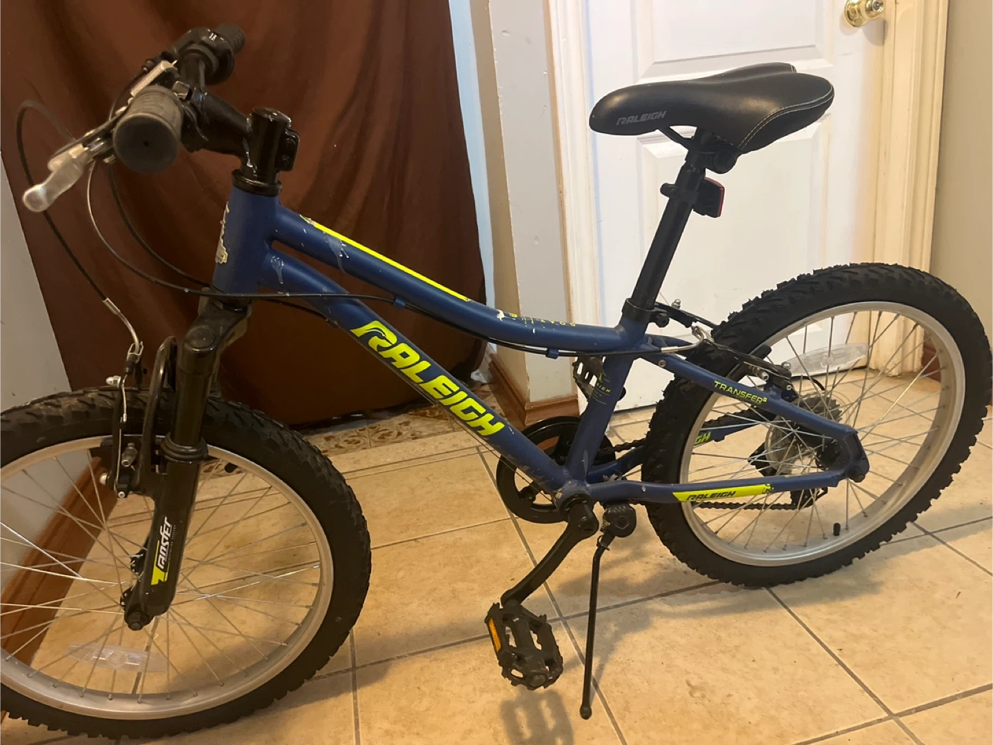 This is a blue Raleigh Transfer boys bike. It has 20-inch wheels and a sturdy frame. Great for learning to ride or for a casual youth rider