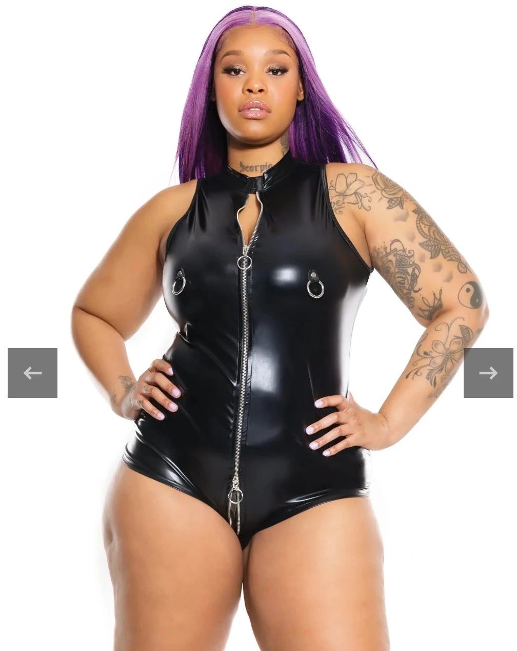 Experience both style and functionality with the front-to-back 2-way metal zipper, reinforced with hook & eye closures for added durability. The metal ring and rivet details add a touch of edginess, while the booty short cut and silver tone hardware complete the look with a sleek and modern touch.