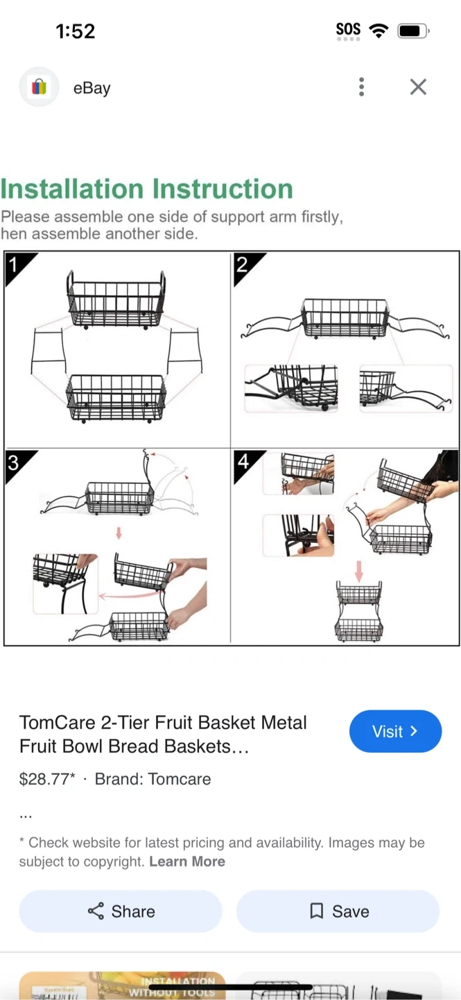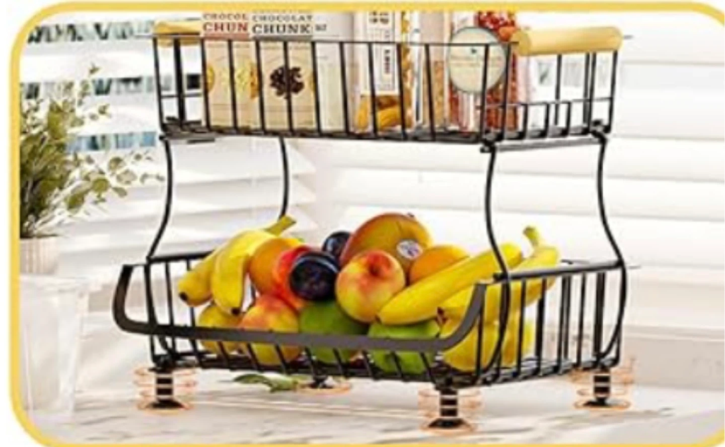 Keep your fruits and veggies organized with this stylish 2-tier fruit basket! It features a sturdy metal frame with a wooden handle for easy carrying. The basket also has replaceable silicone feet to protect your countertops. The dimensions are 24 x 10 x 35.5 cm