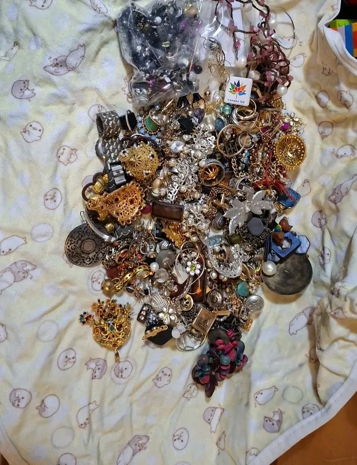 Large collection of assorted vintage costume jewellery. Includes brooches, necklaces, earrings, and more in various styles and colours. Great for crafting or for a collector!