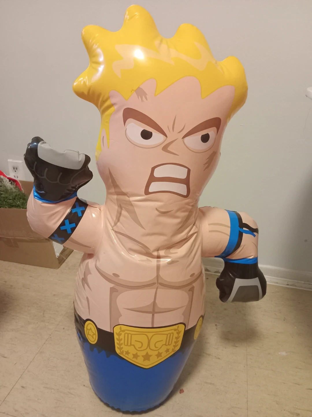 This inflatable punching bag features a cartoon fighter design with a wrestling-style belt. It's made of durable vinyl for bouncing back after every hit. Great for kids' play or as a fun room decoration!