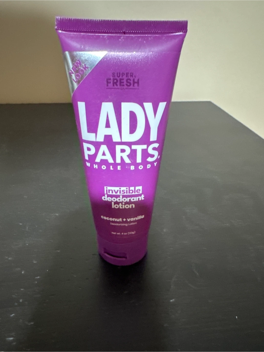 Lady Parts Invisible Deodorant Lotion in coconut + vanilla scent. It's a moisturizing, invisible lotion to prevent damp, smelly lady parts. 4 oz (113g) size. My body doesn’t like this (I am allergic to it)- it was only used once (just a tiny amount).