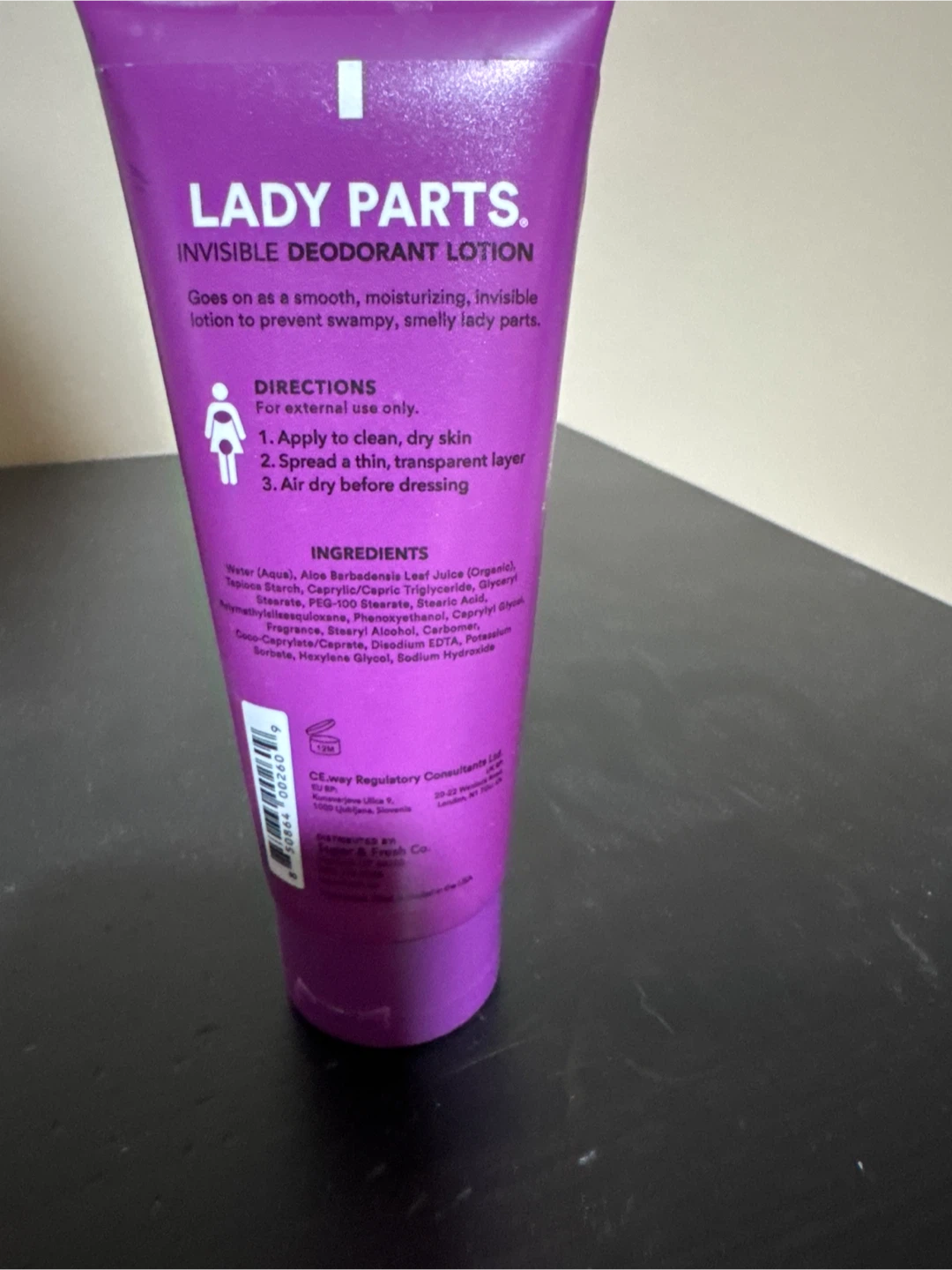 Lady Parts Invisible Deodorant Lotion in coconut + vanilla scent. It's a moisturizing, invisible lotion to prevent damp, smelly lady parts. 4 oz (113g) size. My body doesn’t like this (I am allergic to it)- it was only used once (just a tiny amount).