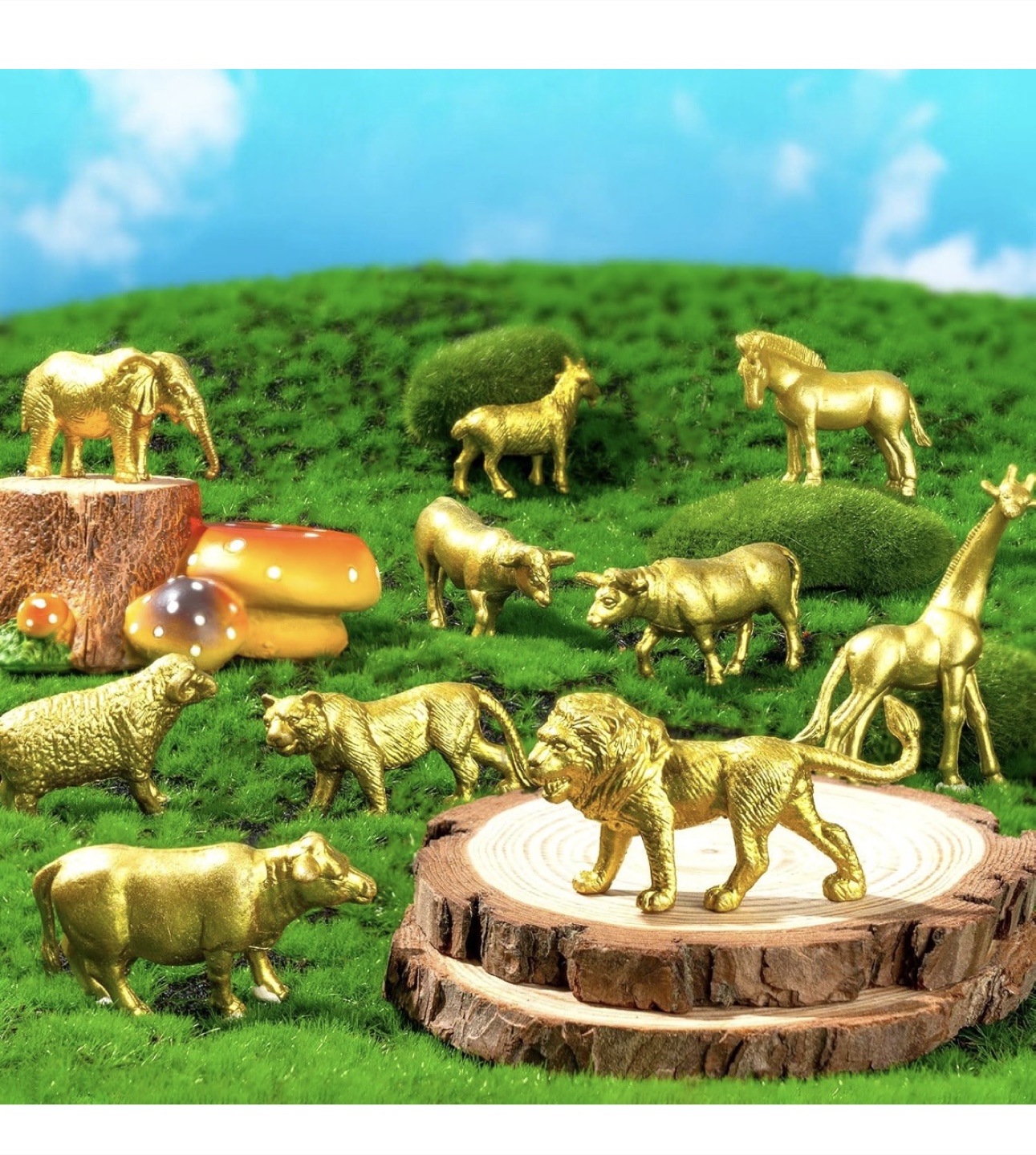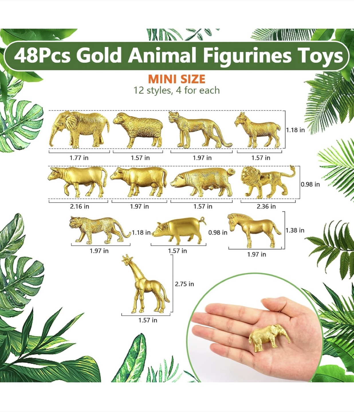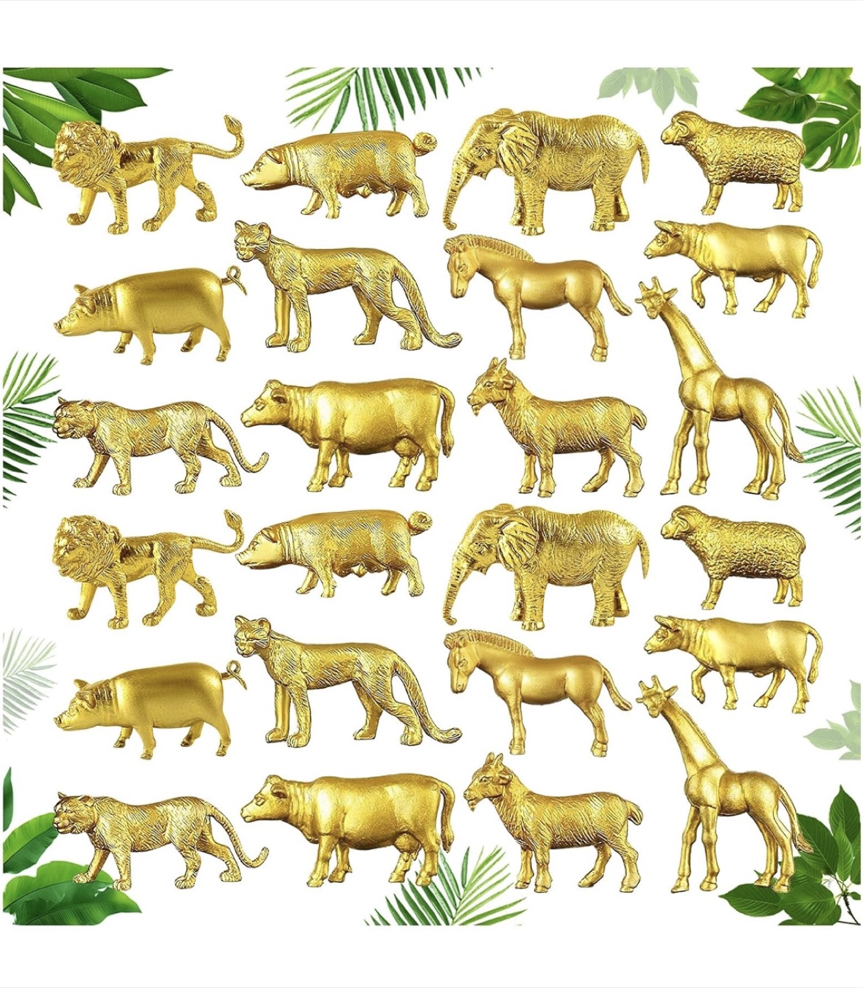 Selling a set of 48 gold animal figurines! These mini-sized toys come in 12 different styles, with 4 of each animal. They're great for cake decorations, party supplies, or just for fun!