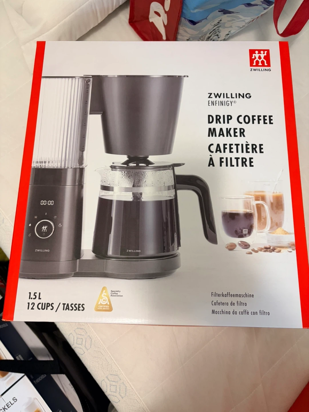 This ZWILLING ENFINIGY drip coffee maker boasts a 1.5L glass carafe, perfect for brewing up to 12 cups. It features a sleek black design to complement any kitchen counter. Makes delicious coffee at home!