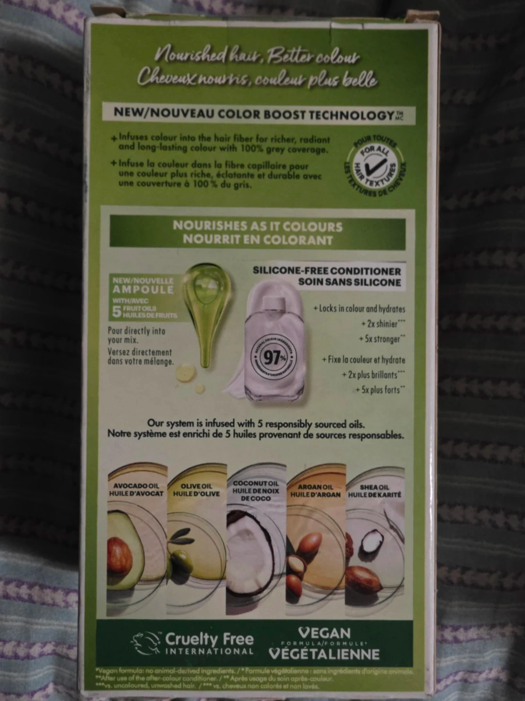 Nourishing permanent hair colour with 100% grey coverage. It's infused with 5 oils for richer colour and longer-lasting results. Each box includes a new/nouvelle ampoule with 5 fruit oils.