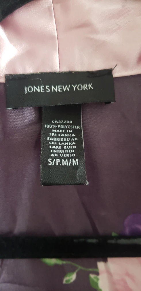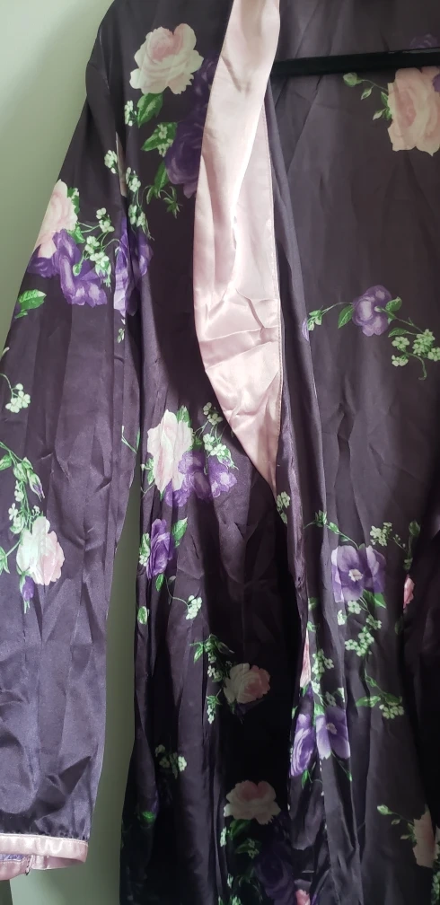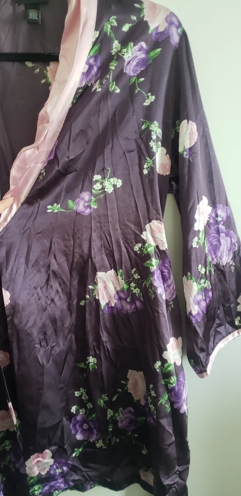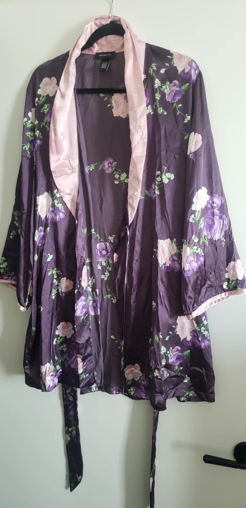 Women's Jones New York Satin Robe. Purple with a floral print. Three quarter length sleeves. Matching tie belt. Size Small/Medium.