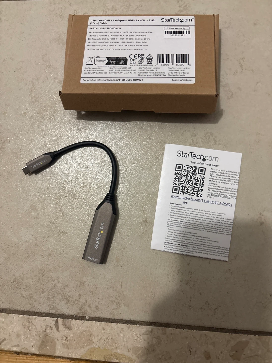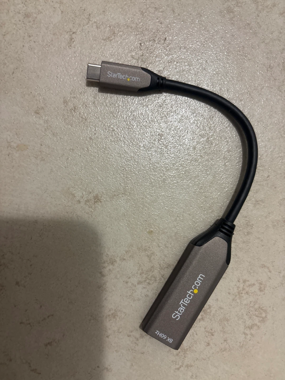 This StarTech.com adapter connects USB-C to HDMI 2.1. It supports 8K resolution at 60Hz and is 7.9 inches long. The cable is included in the original box.