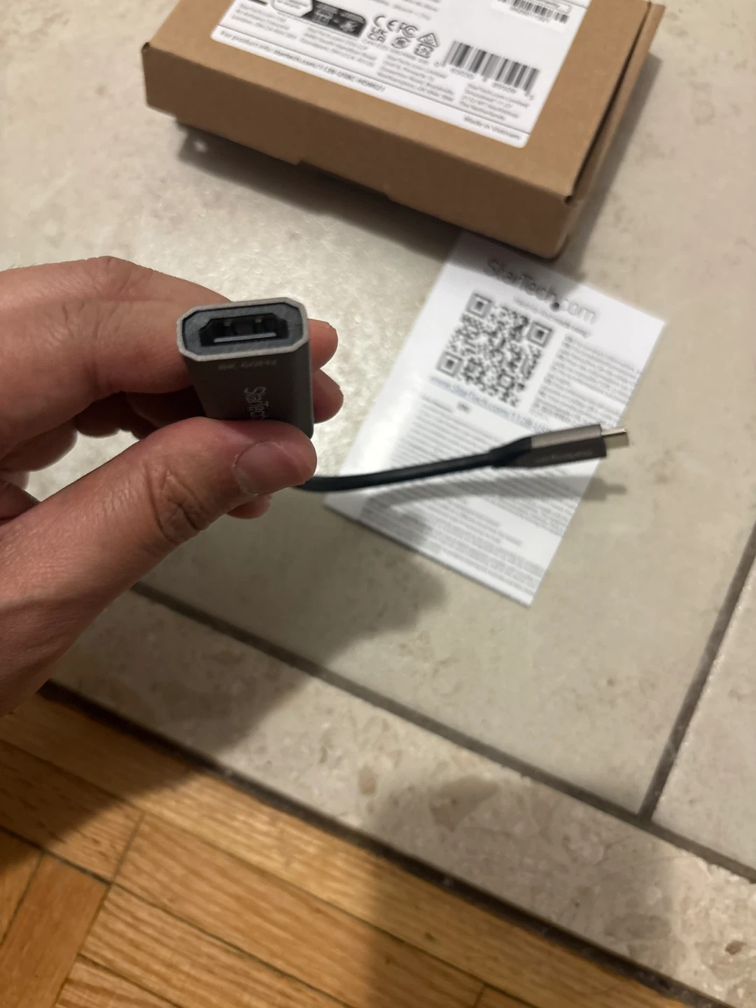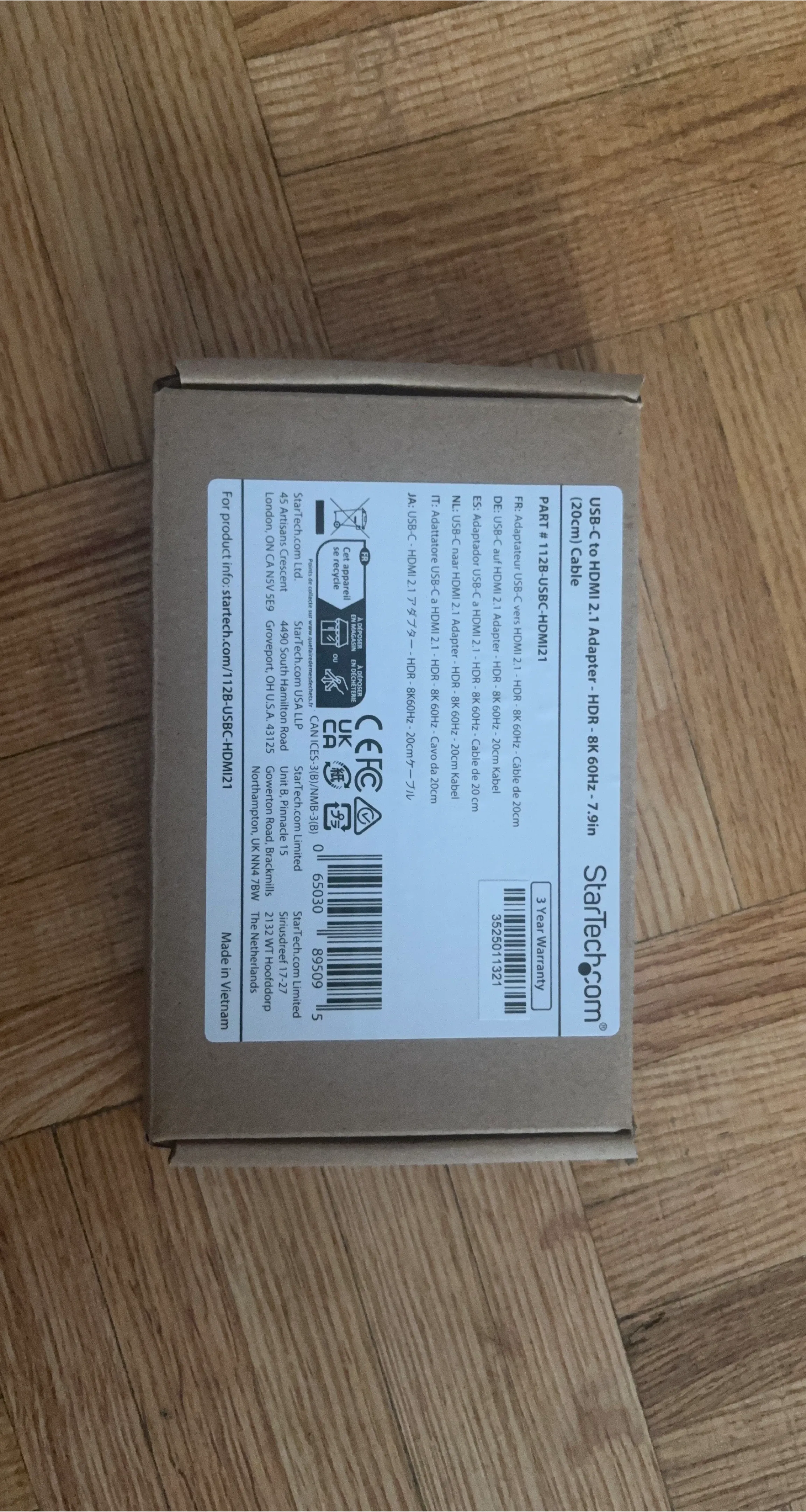 This StarTech.com adapter connects USB-C to HDMI 2.1. It supports 8K resolution at 60Hz and is 7.9 inches long. The cable is included in the original box.